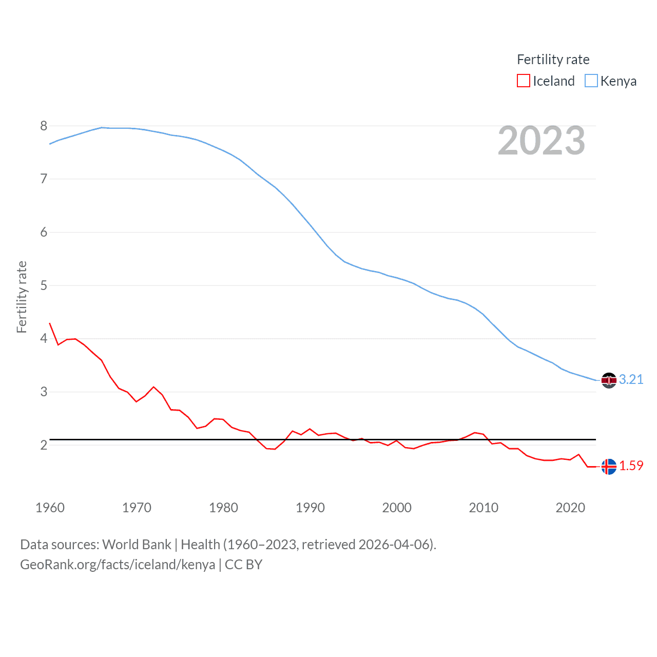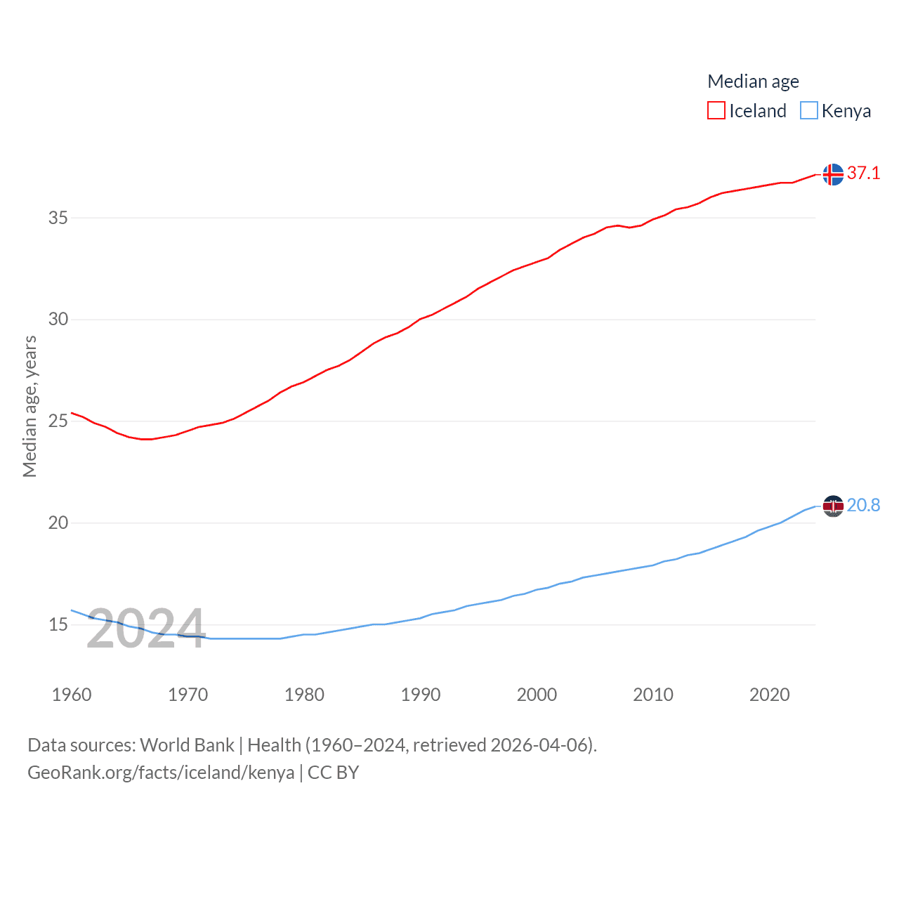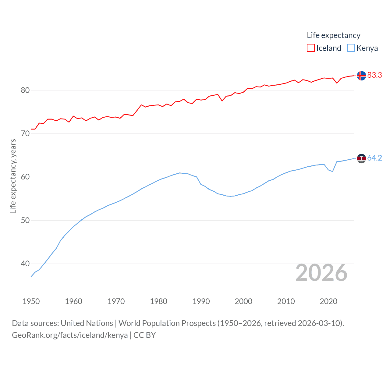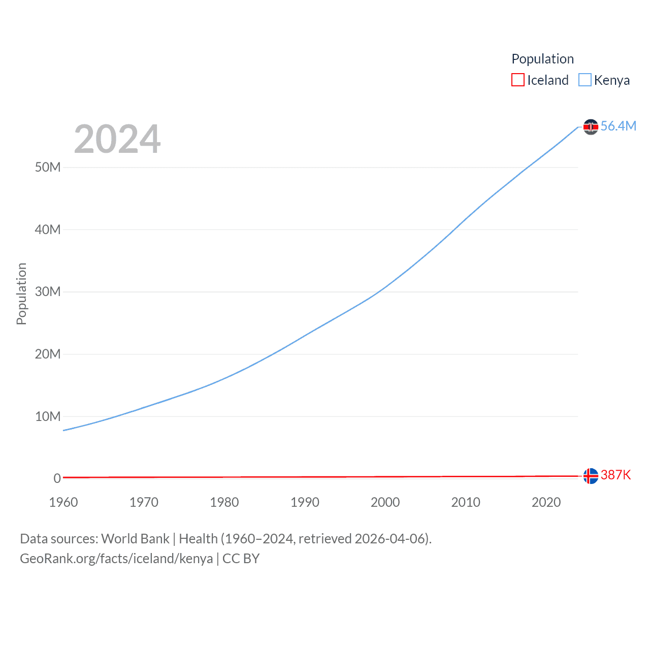 Iceland has a population of 387K (ranked 173/197), compared with 56.4M in Kenya (ranked 26/197). Iceland's land area is 38,931 sq mi versus 224,278 sq mi for Kenya (ranked 104th vs. 45th).