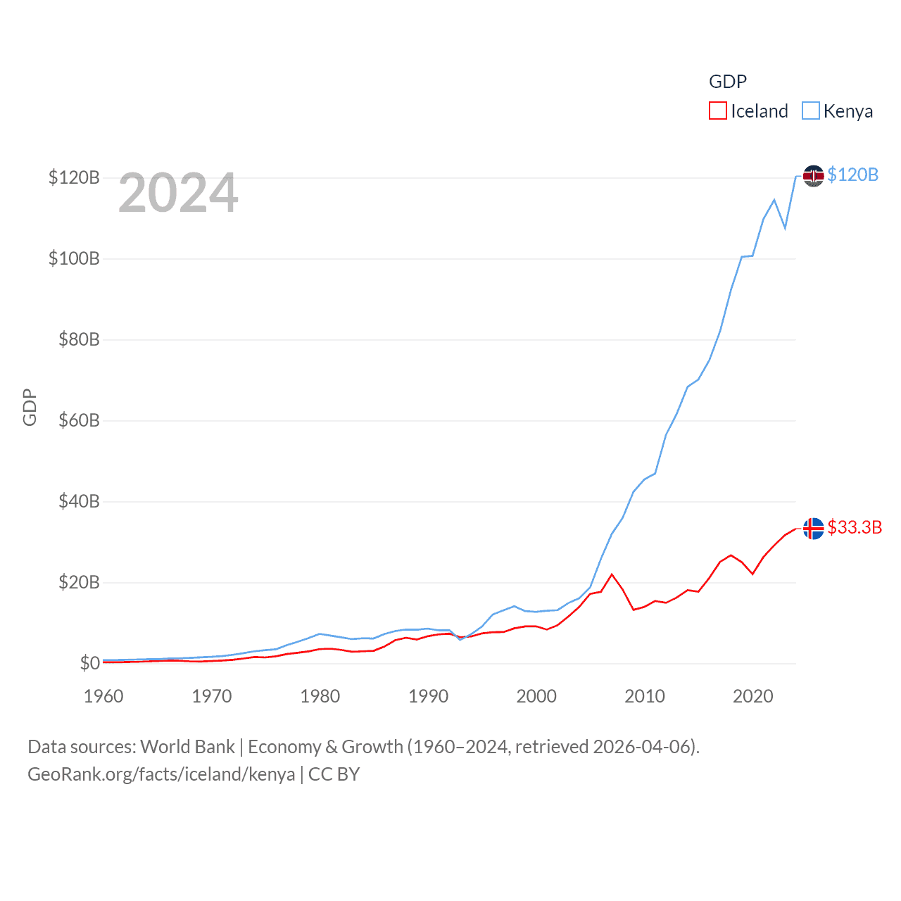 By GDP, Iceland ranks 108/197 ($33.3B) and Kenya ranks 64/197 ($120B). By GDP per capita, Iceland ranks 9/197 ($86,041), while Kenya ranks 154/197 ($2,132).