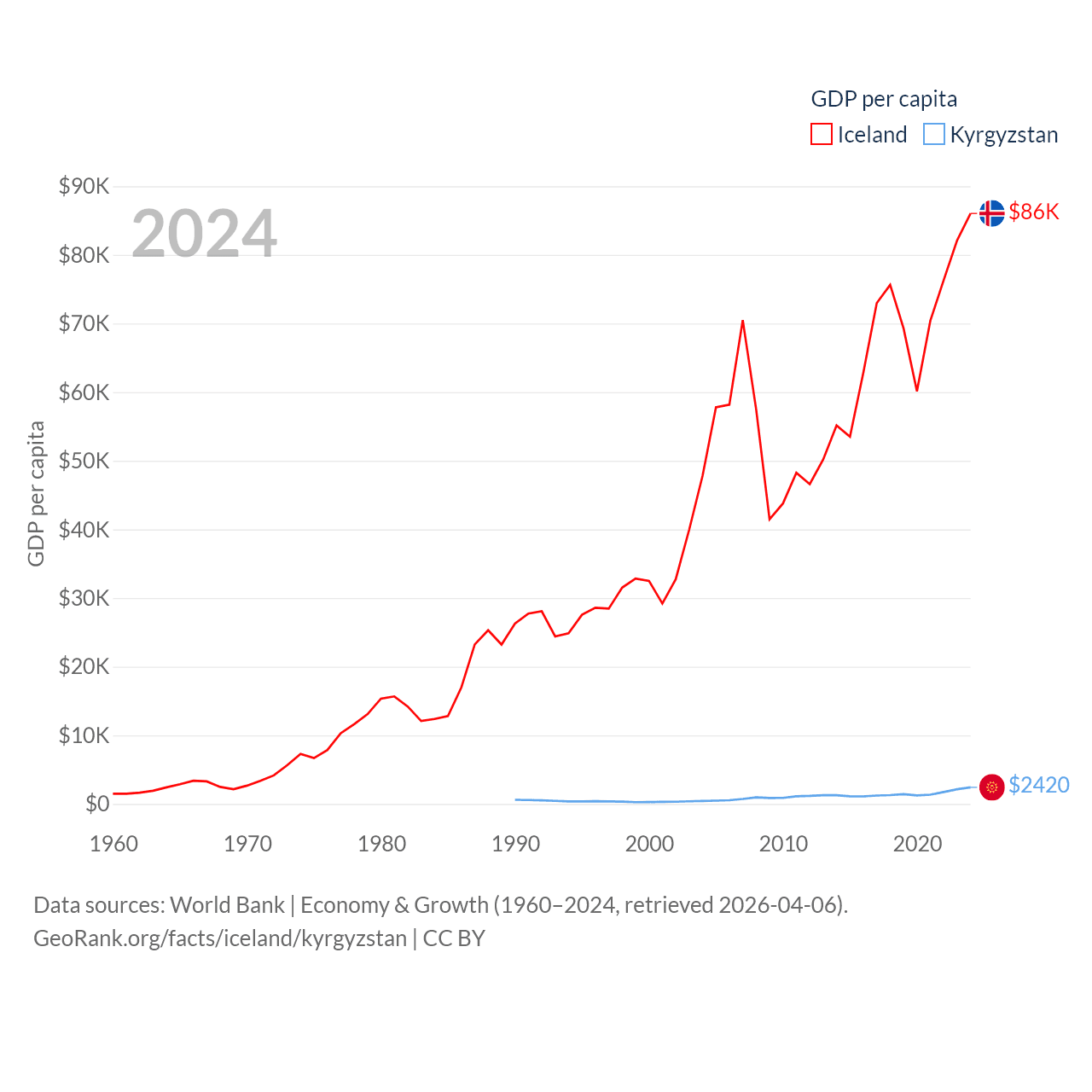 By GDP, Iceland ranks 108/197 ($33.3B) and Kyrgyzstan ranks 135/197 ($17.5B). By GDP per capita, Iceland ranks 9/197 ($86,041), while Kyrgyzstan ranks 150/197 ($2,420).