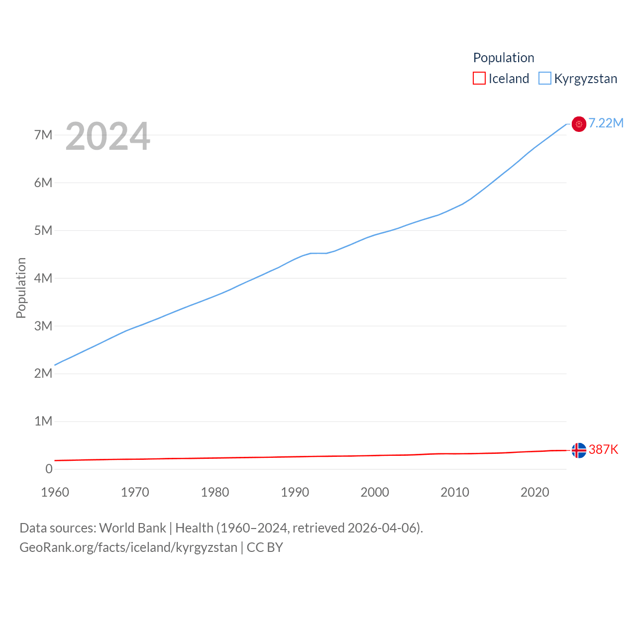 Iceland has a population of 387K (ranked 173/197), compared with 7.22M in Kyrgyzstan (ranked 106/197). Iceland's land area is 38,931 sq mi versus 74,054 sq mi for Kyrgyzstan (ranked 104th vs. 86th).