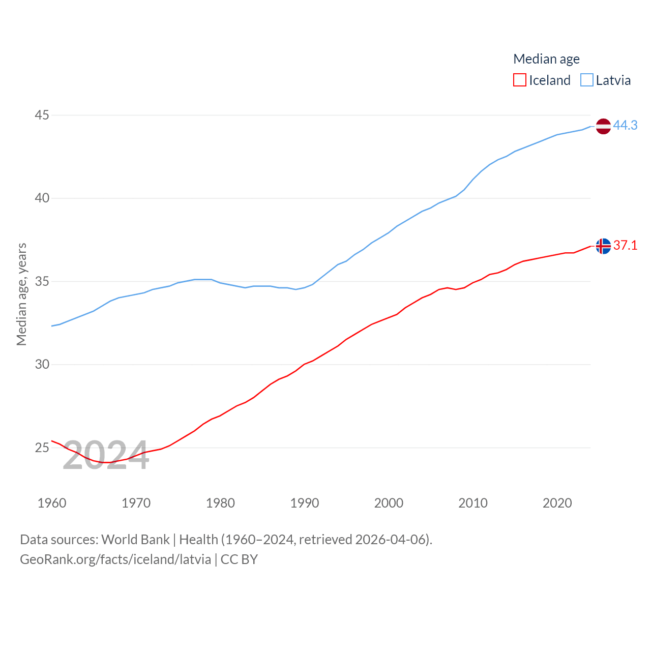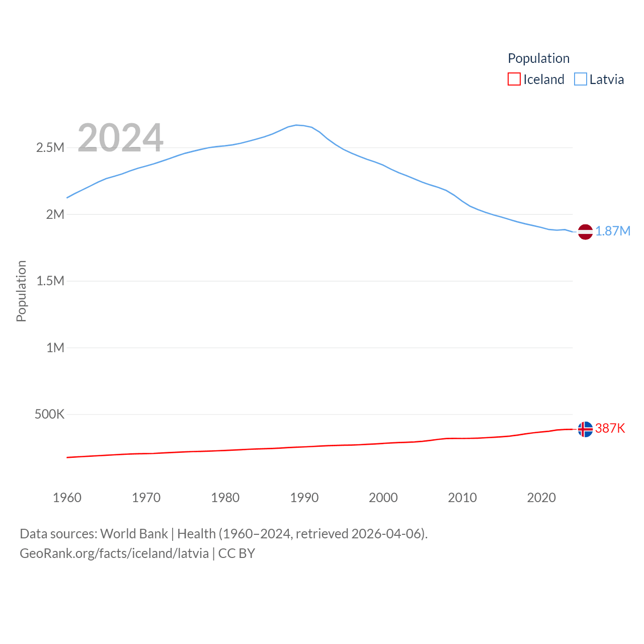 Iceland has a population of 387K (ranked 173/197), compared with 1.87M in Latvia (ranked 149/197). Iceland's land area is 38,931 sq mi versus 24,027 sq mi for Latvia (ranked 104th vs. 121st).