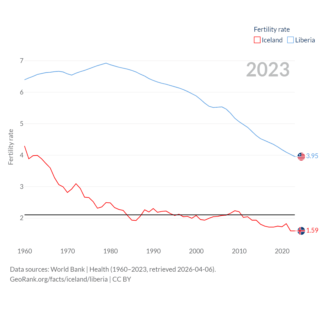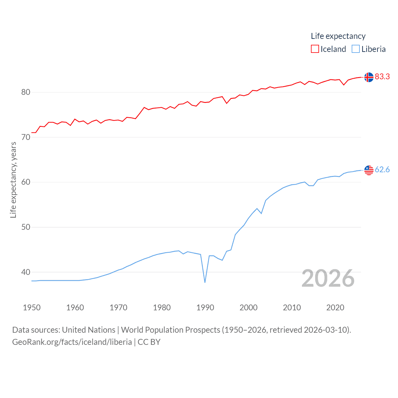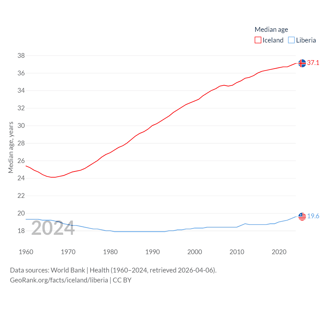 Iceland has a population of 387K (ranked 173/197), compared with 5.61M in Liberia (ranked 117/197). Iceland's land area is 38,931 sq mi versus 37,189 sq mi for Liberia (ranked 104th vs. 106th).