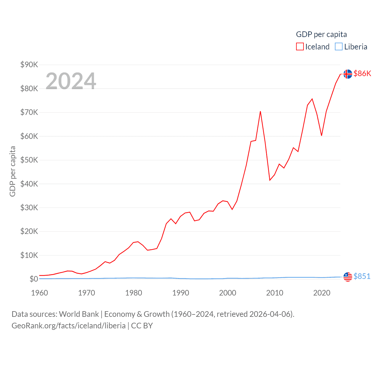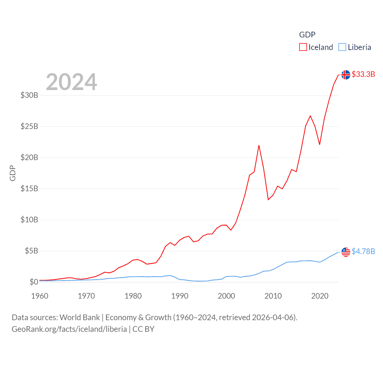 By GDP, Iceland ranks 108/197 ($33.3B) and Liberia ranks 163/197 ($4.78B). By GDP per capita, Iceland ranks 9/197 ($86,041), while Liberia ranks 184/197 ($851).