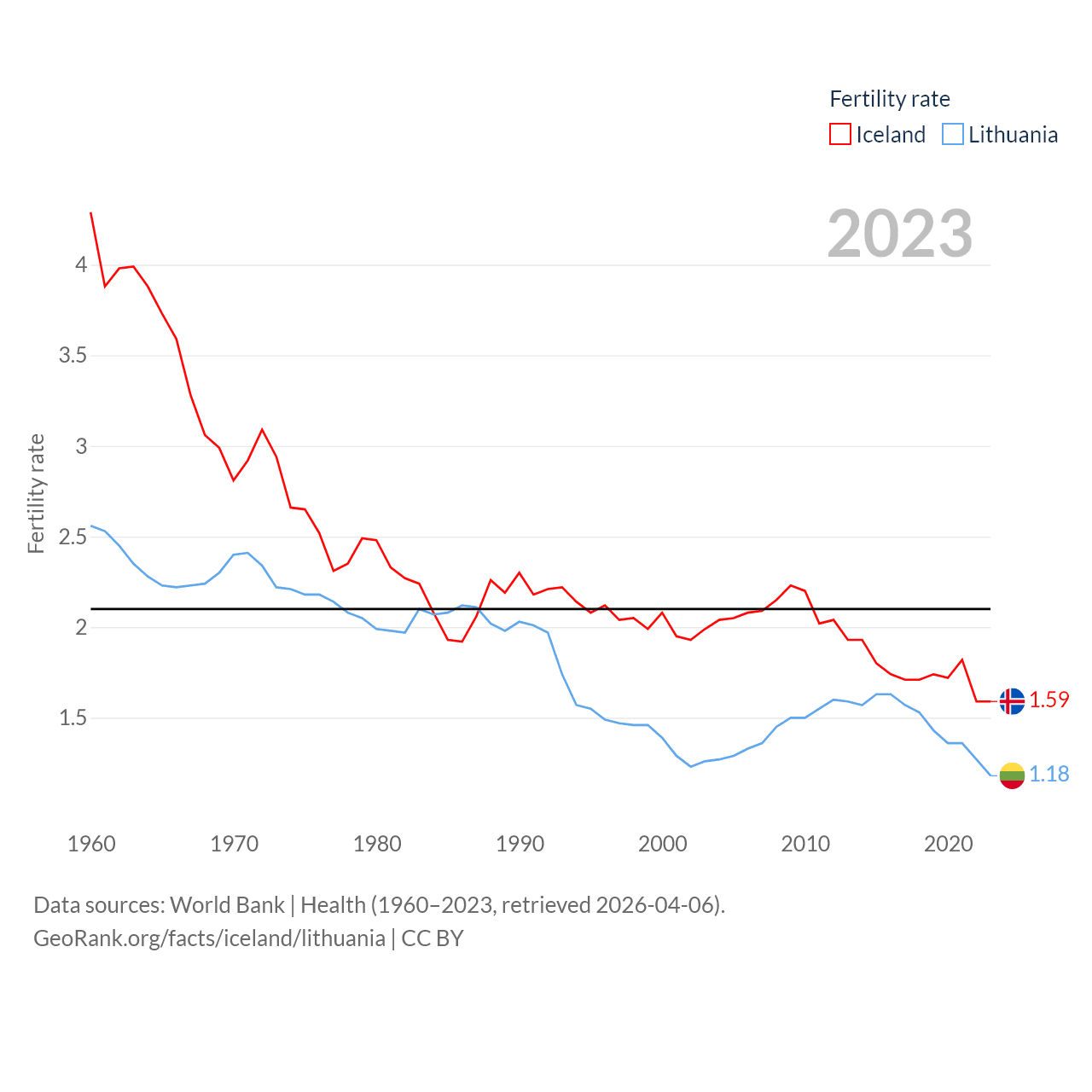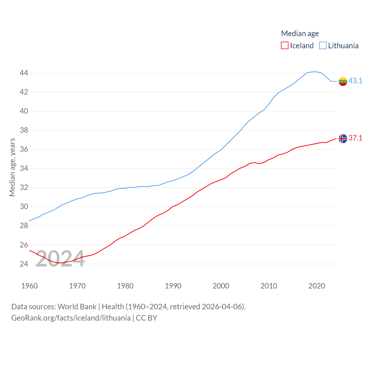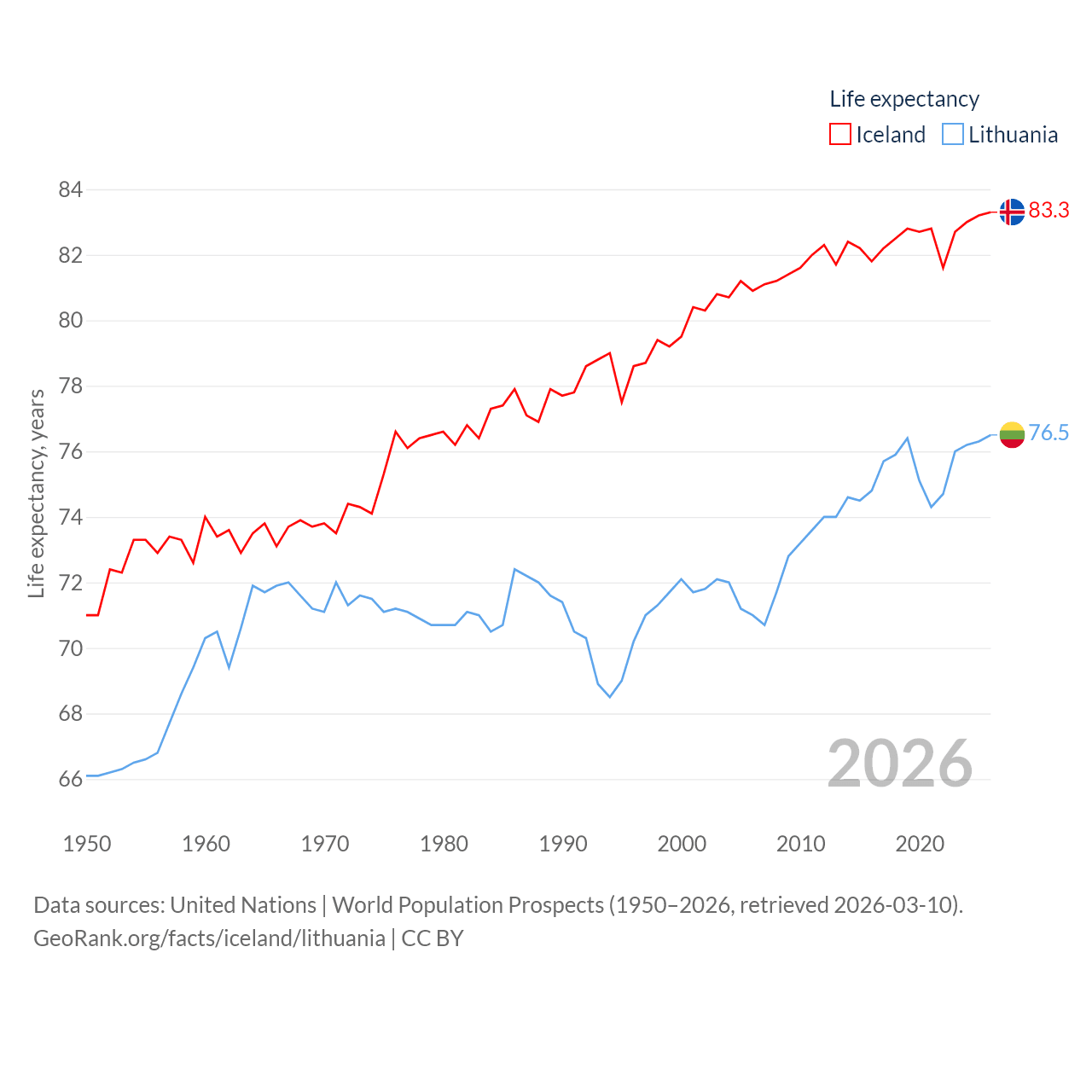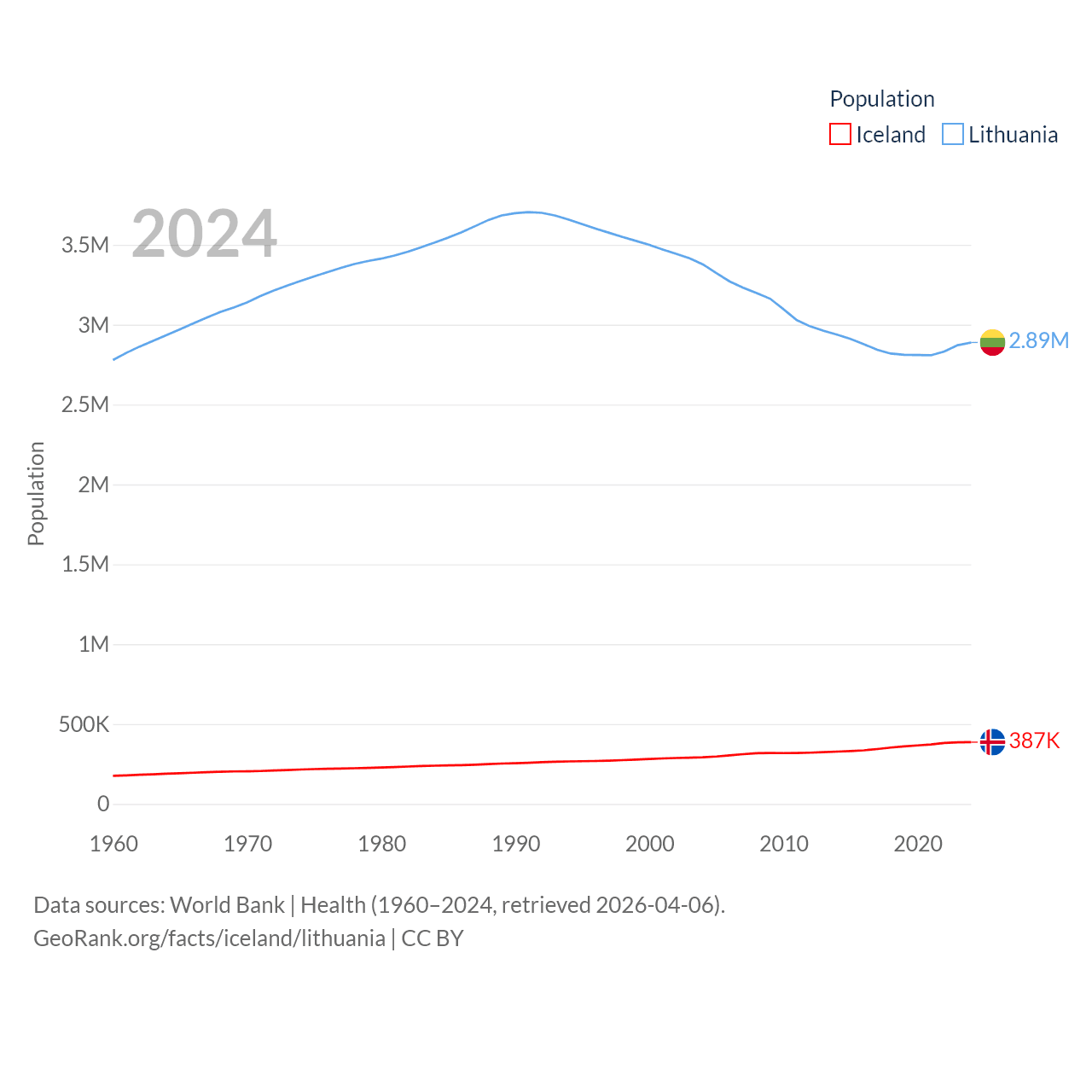 Iceland has a population of 387K (ranked 173/197), compared with 2.89M in Lithuania (ranked 137/197). Iceland's land area is 38,931 sq mi versus 24,170 sq mi for Lithuania (ranked 104th vs. 120th).