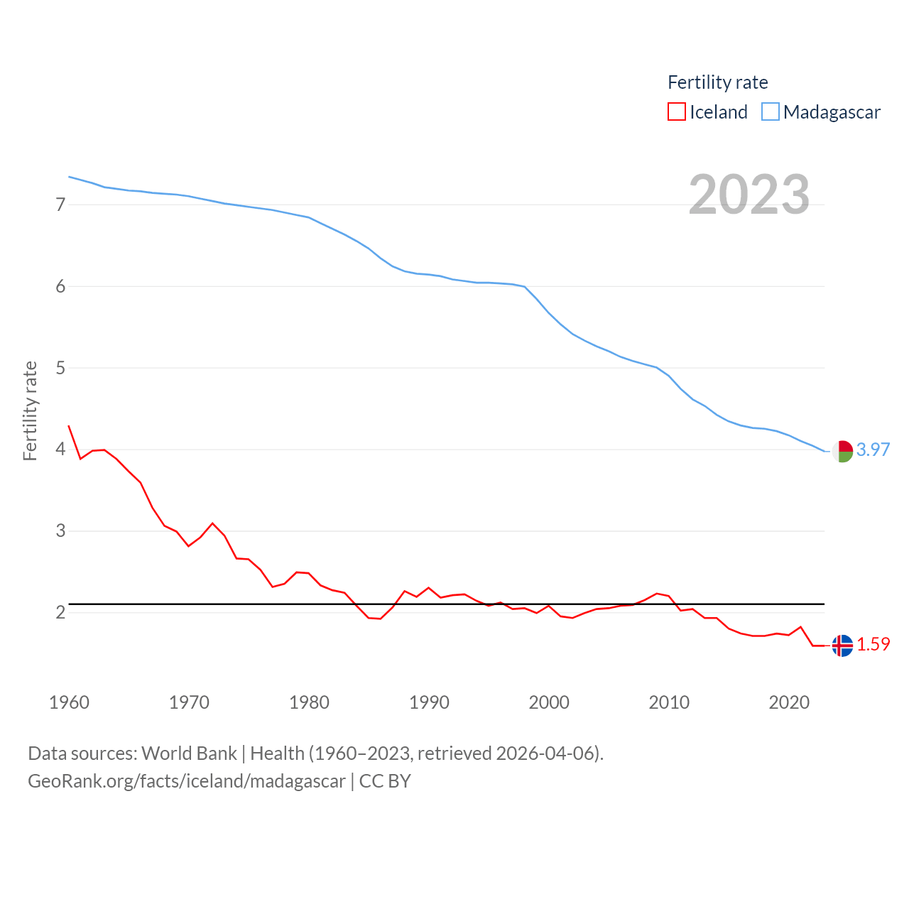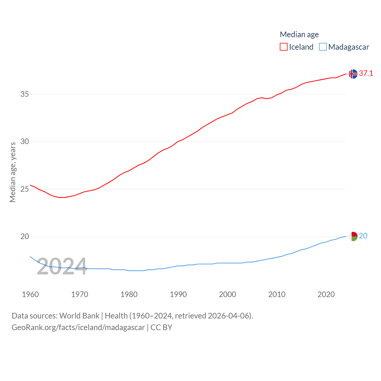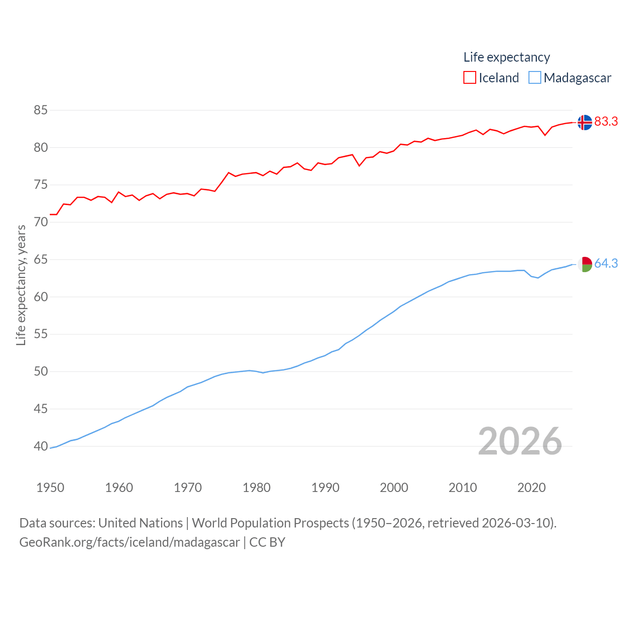 Iceland has a population of 387K (ranked 173/197), compared with 32M in Madagascar (ranked 49/197). Iceland's land area is 38,931 sq mi versus 224,634 sq mi for Madagascar (ranked 104th vs. 44th).