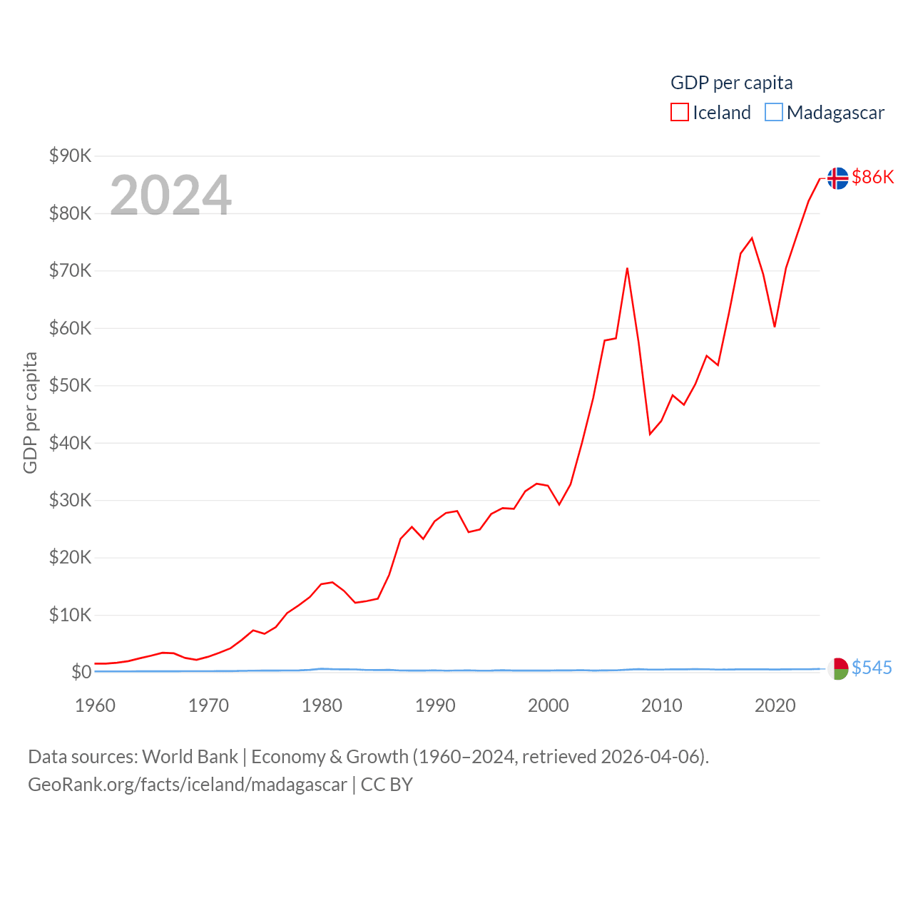 By GDP, Iceland ranks 108/197 ($33.3B) and Madagascar ranks 136/197 ($17.4B). By GDP per capita, Iceland ranks 9/197 ($86,041), while Madagascar ranks 193/197 ($545).