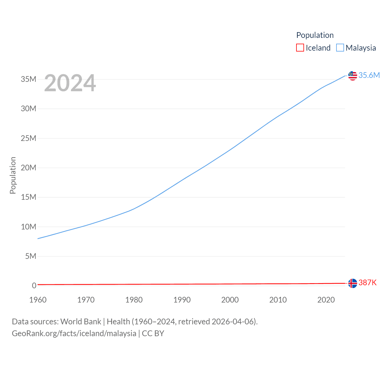 Iceland has a population of 387K (ranked 173/197), compared with 35.6M in Malaysia (ranked 44/197). Iceland's land area is 38,931 sq mi versus 126,854 sq mi for Malaysia (ranked 104th vs. 65th).