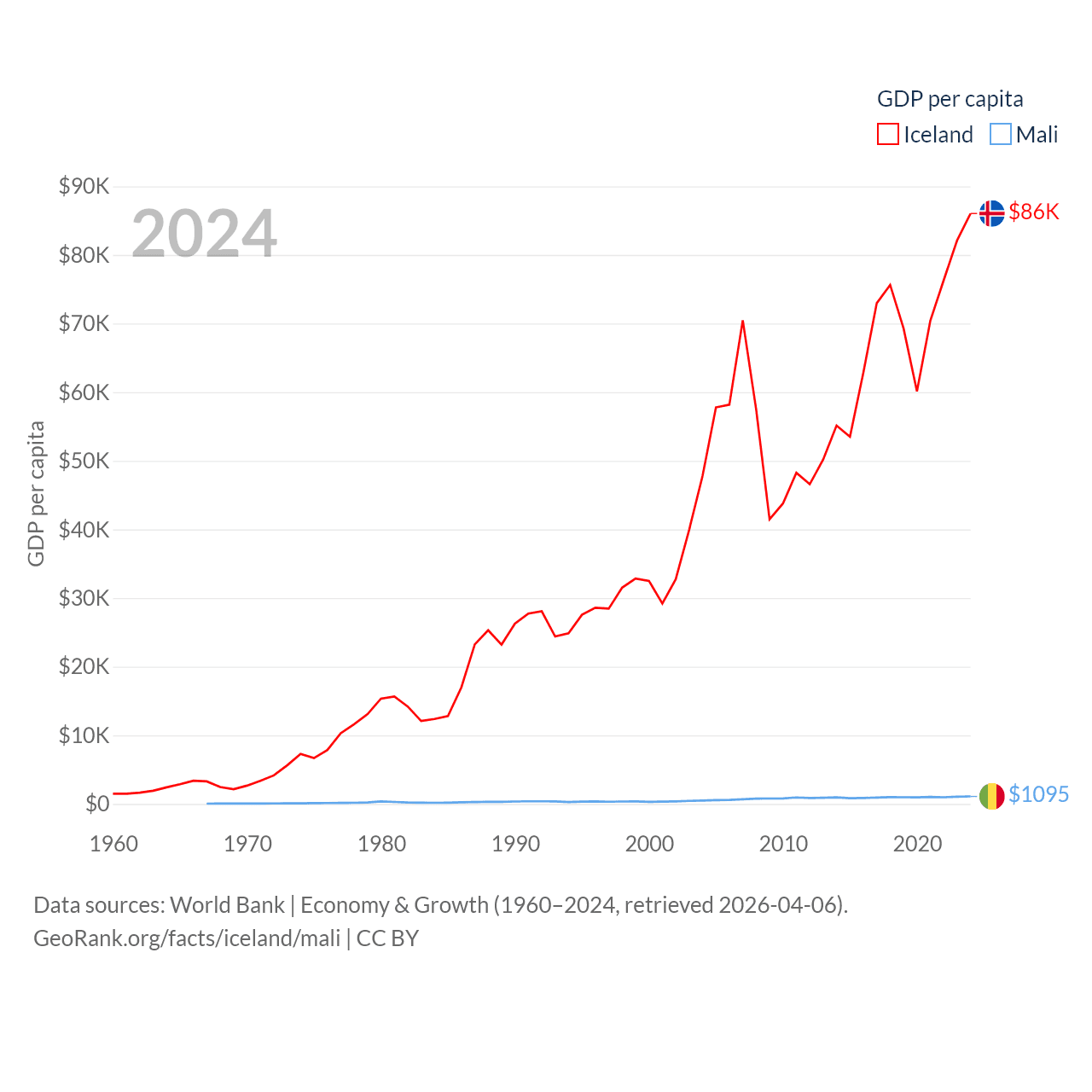 By GDP, Iceland ranks 108/197 ($33.3B) and Mali ranks 113/197 ($26.8B). By GDP per capita, Iceland ranks 9/197 ($86,041), while Mali ranks 173/197 ($1,095).