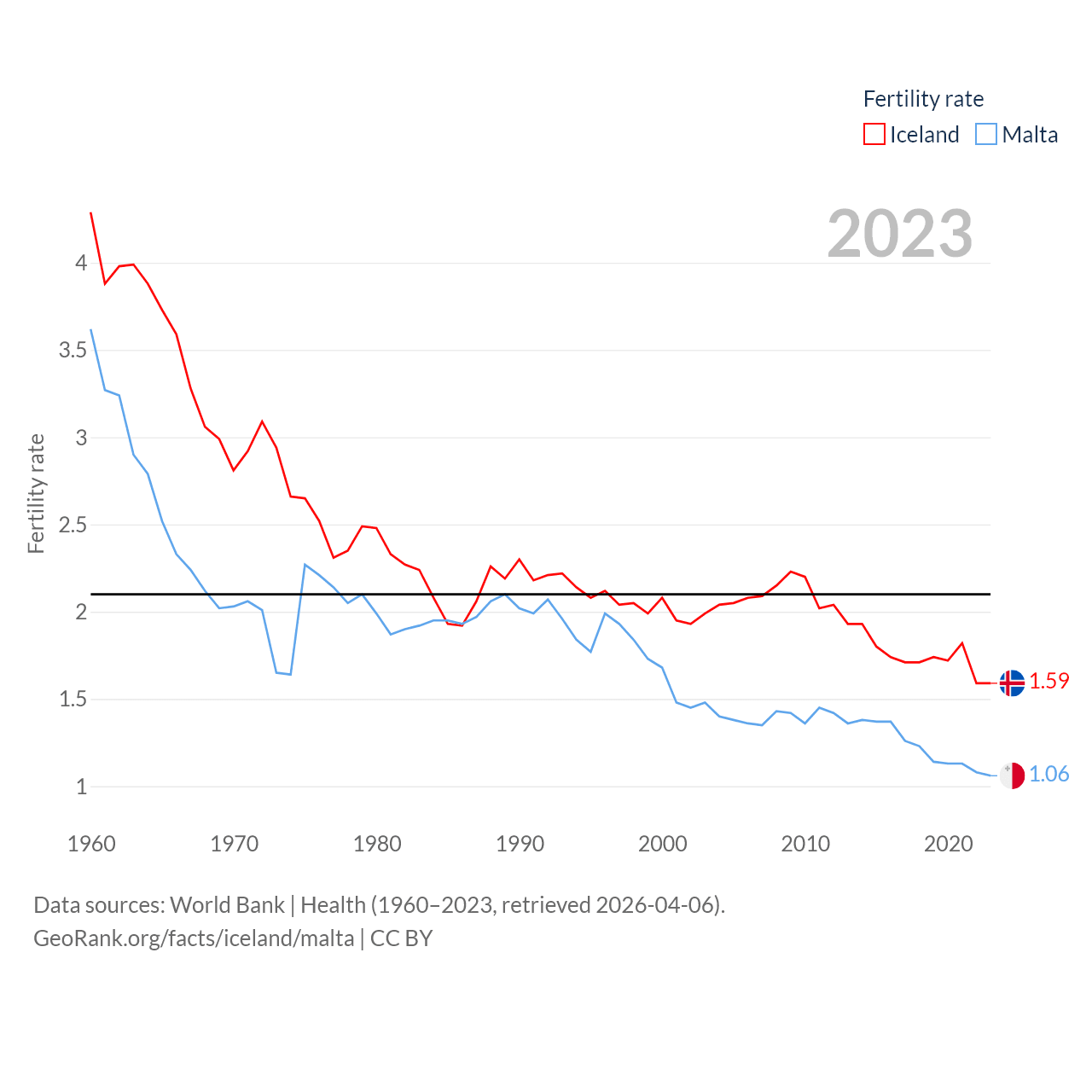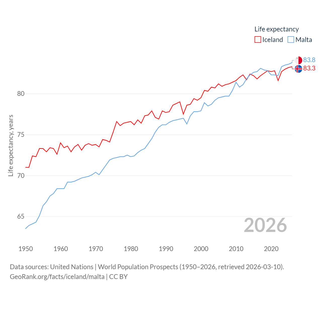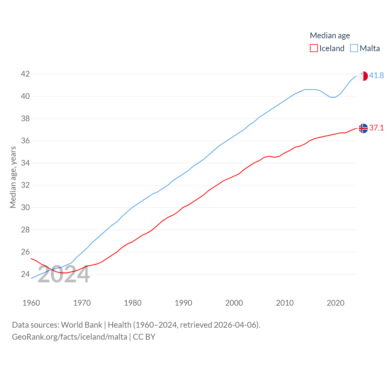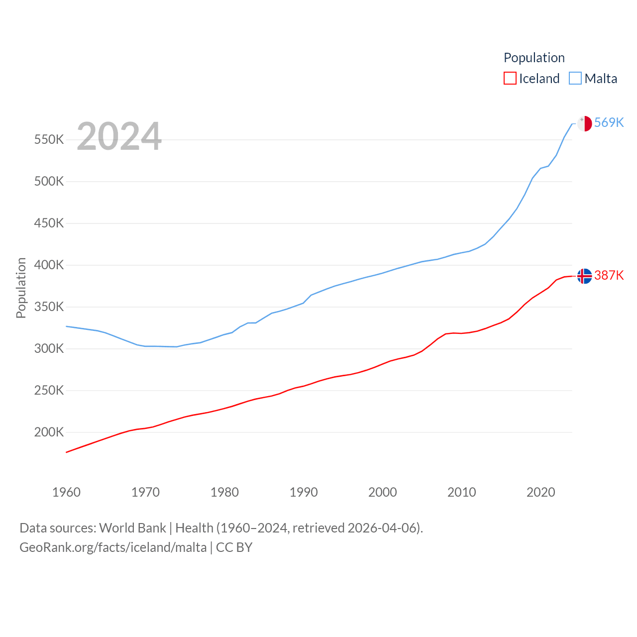 Iceland has a population of 387K (ranked 173/197), compared with 569K in Malta (ranked 167/197). Iceland's land area is 38,931 sq mi versus 123.6 sq mi for Malta (ranked 104th vs. 187th).