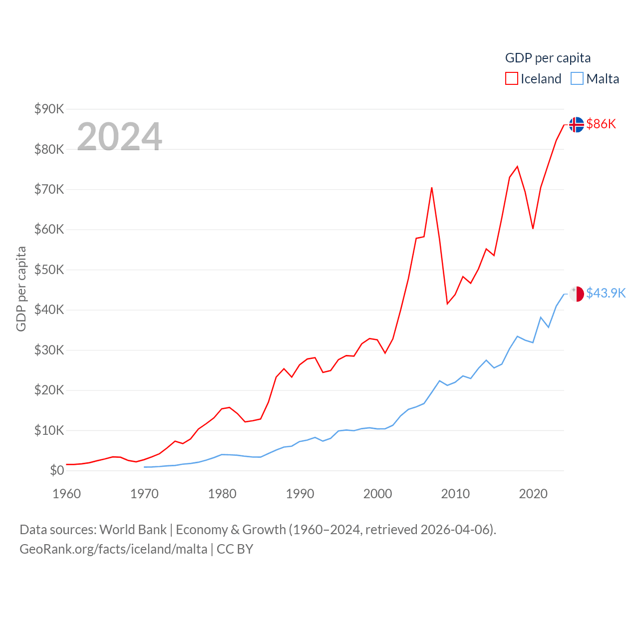By GDP, Iceland ranks 108/197 ($33.3B) and Malta ranks 119/197 ($25B). By GDP per capita, Iceland ranks 9/197 ($86,041), while Malta ranks 28/197 ($43,899).