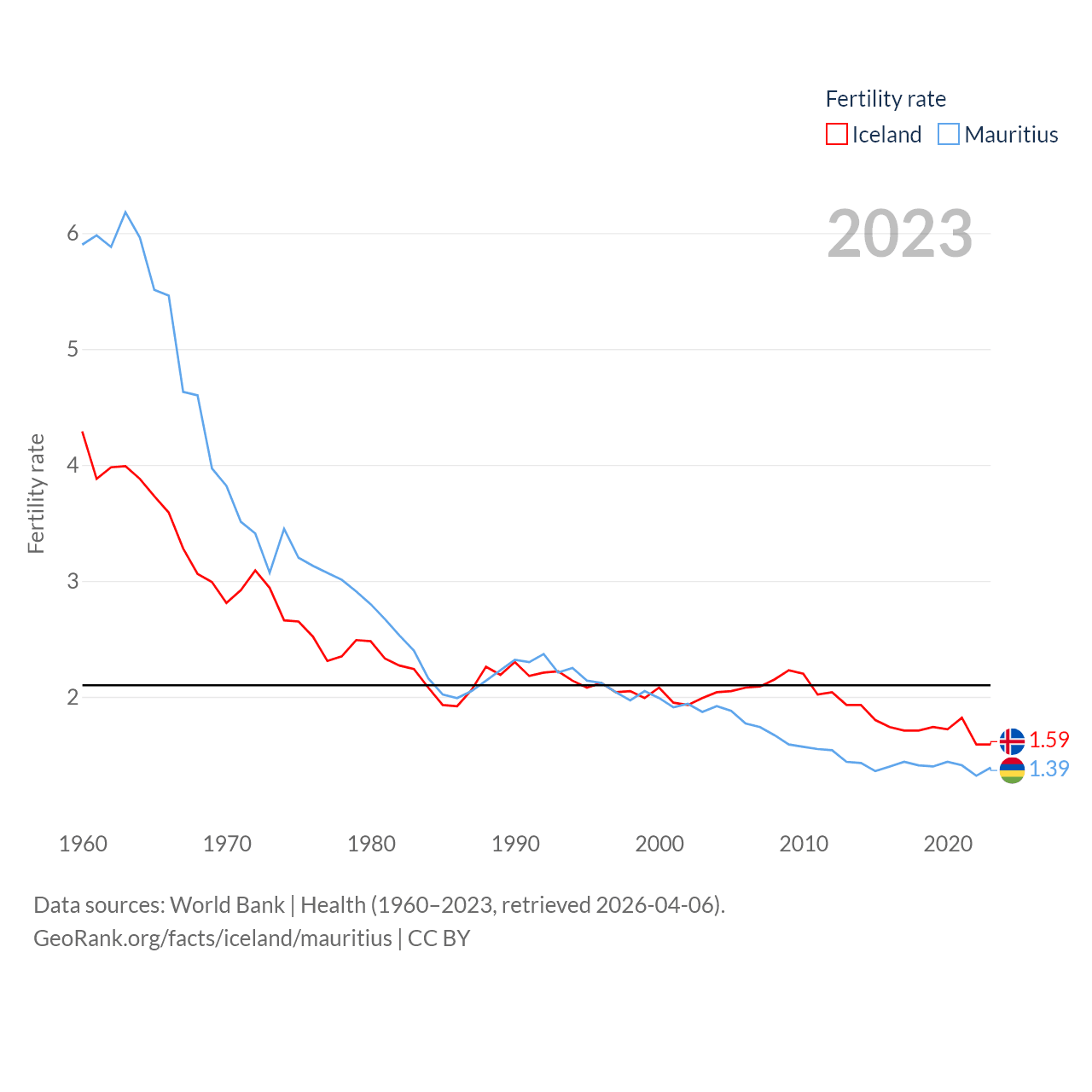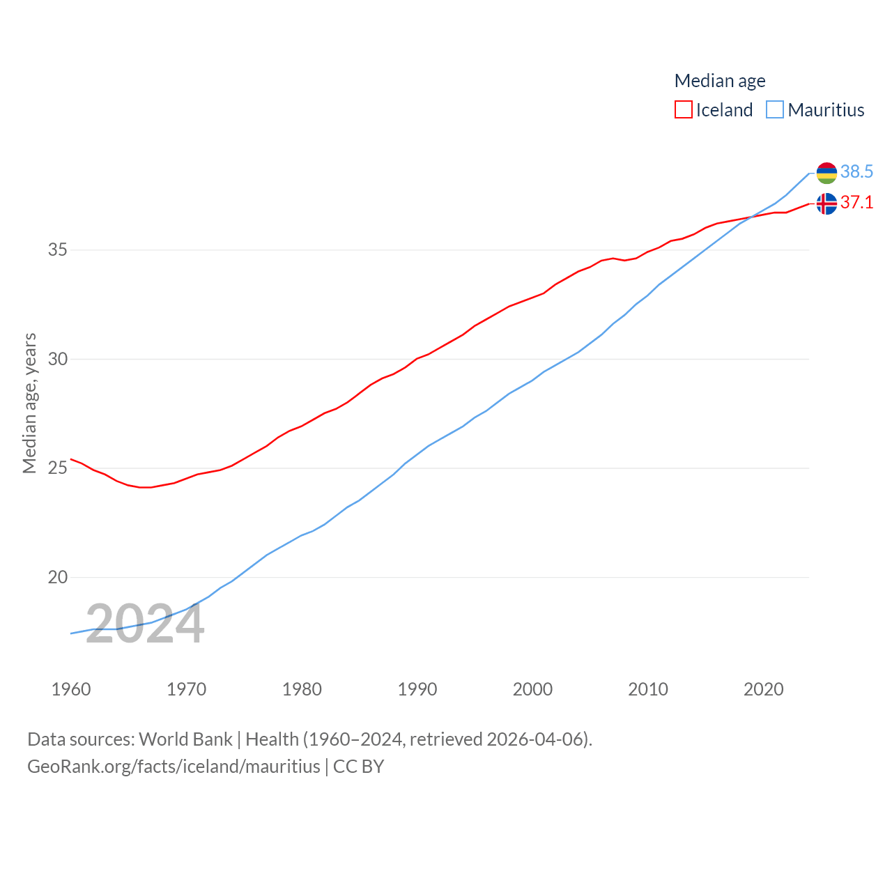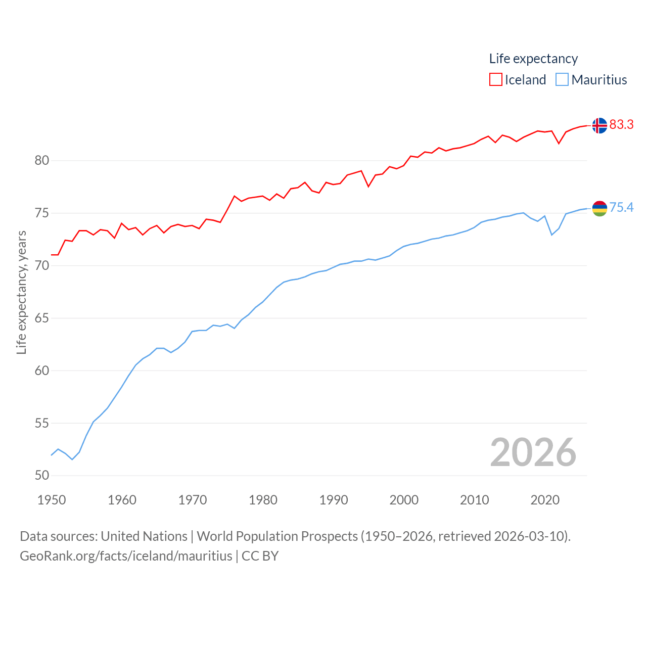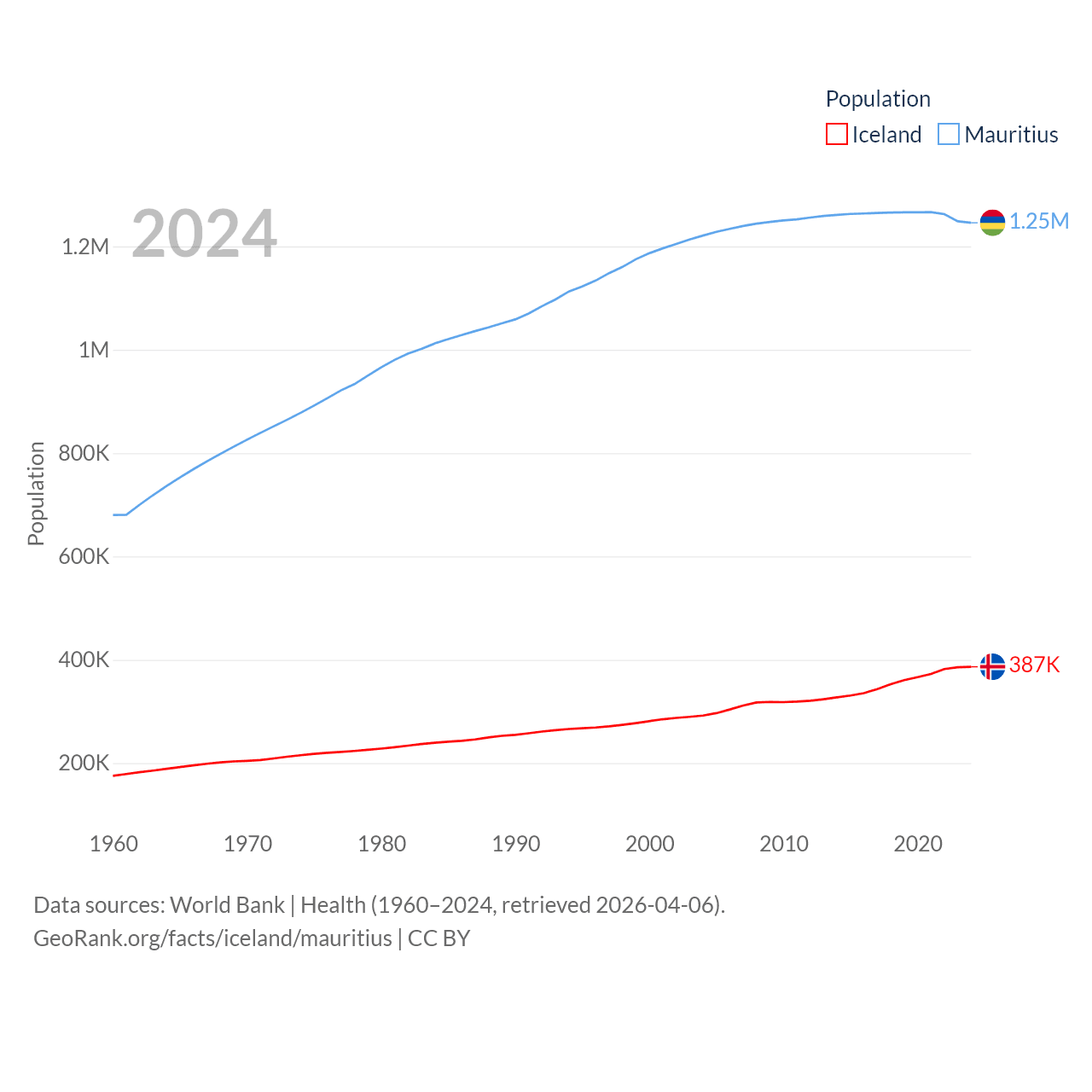 Iceland has a population of 387K (ranked 173/197), compared with 1.25M in Mauritius (ranked 156/197). Iceland's land area is 38,931 sq mi versus 771 sq mi for Mauritius (ranked 104th vs. 170th).