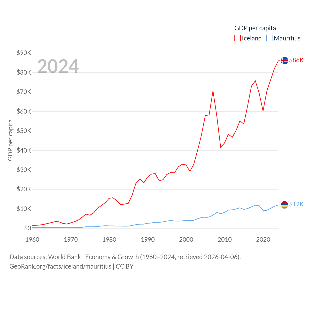 By GDP, Iceland ranks 108/197 ($33.3B) and Mauritius ranks 143/197 ($14.9B). By GDP per capita, Iceland ranks 9/197 ($86,041), while Mauritius ranks 78/197 ($11,991).