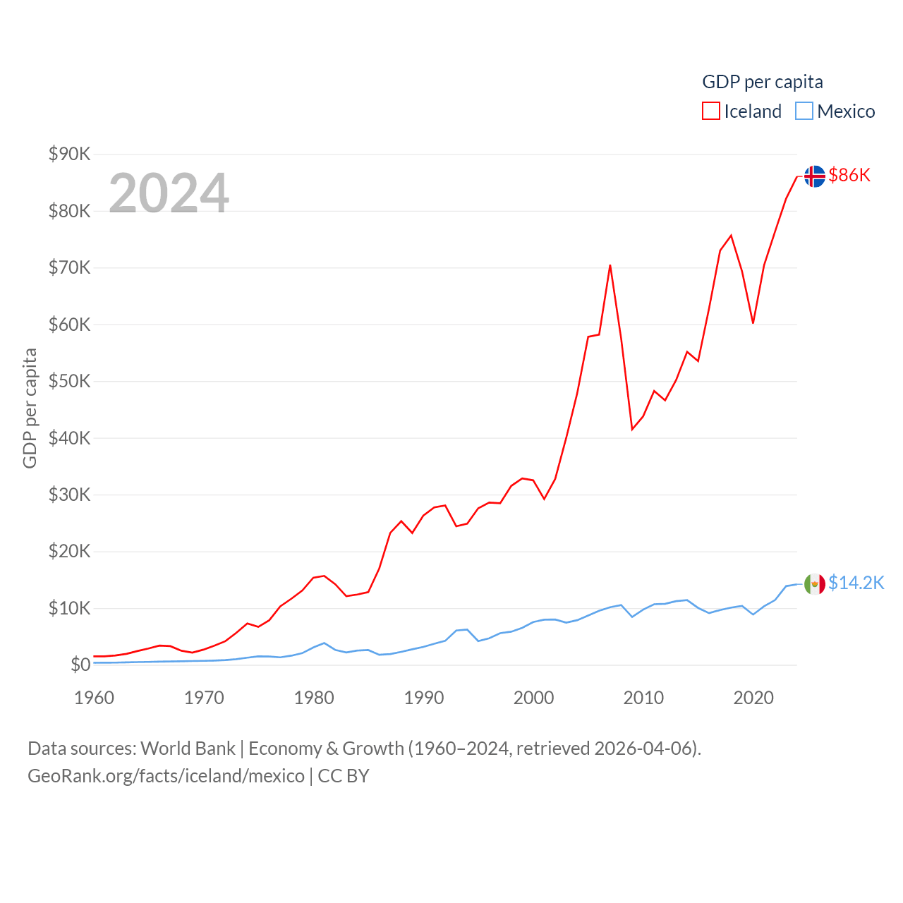 By GDP, Iceland ranks 108/197 ($33.3B) and Mexico ranks 13/197 ($1.86T). By GDP per capita, Iceland ranks 9/197 ($86,041), while Mexico ranks 69/197 ($14,186).