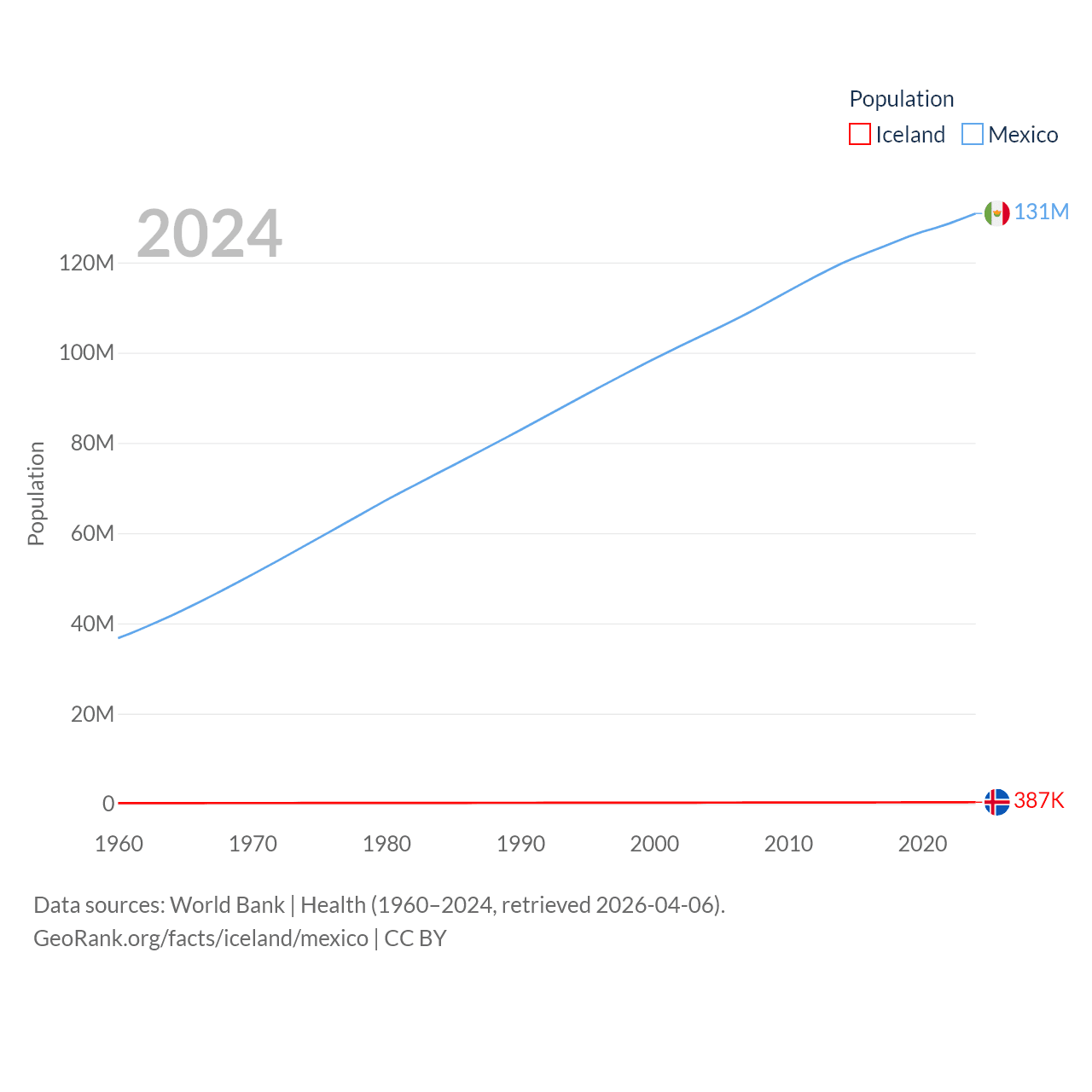 Iceland has a population of 387K (ranked 173/197), compared with 131M in Mexico (ranked 11/197). Iceland's land area is 38,931 sq mi versus 750,563 sq mi for Mexico (ranked 104th vs. 13th).