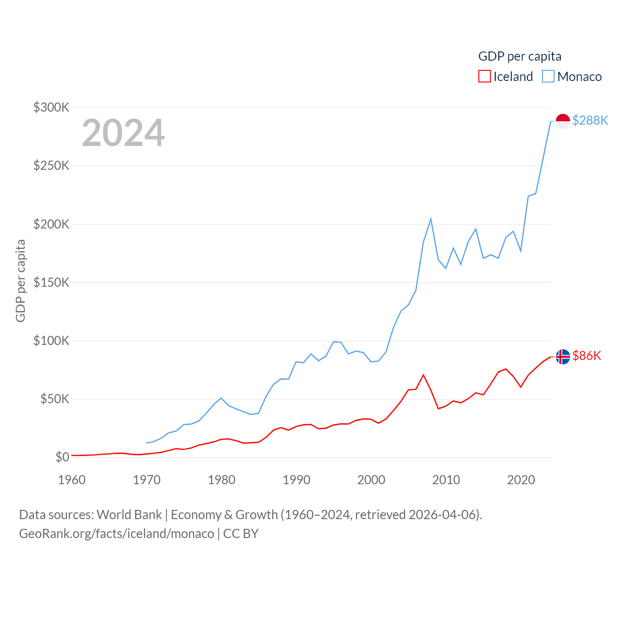 By GDP, Iceland ranks 108/197 ($33.3B) and Monaco ranks 152/197 ($11.1B). By GDP per capita, Iceland ranks 9/197 ($86,041), while Monaco ranks 1/197 ($288,001).