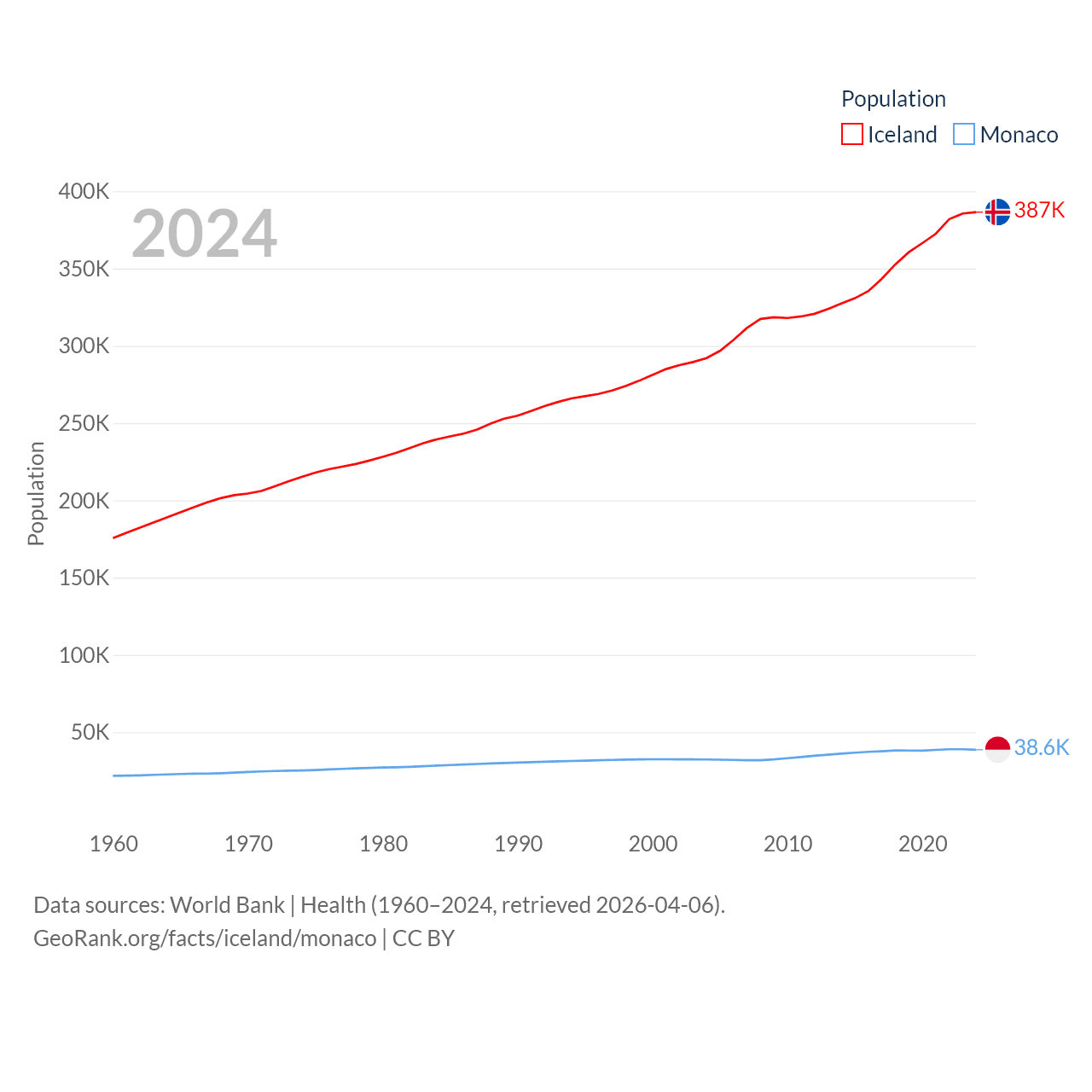 Iceland has a population of 387K (ranked 173/197), compared with 38.6K in Monaco (ranked 191/197). Iceland's land area is 38,931 sq mi versus 0.8 sq mi for Monaco (ranked 104th vs. 196th).