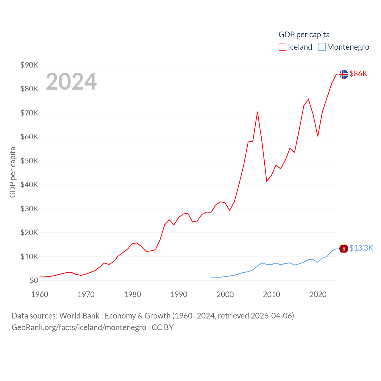 By GDP, Iceland ranks 108/197 ($33.3B) and Montenegro ranks 155/197 ($8.27B). By GDP per capita, Iceland ranks 9/197 ($86,041), while Montenegro ranks 77/197 ($13,263).