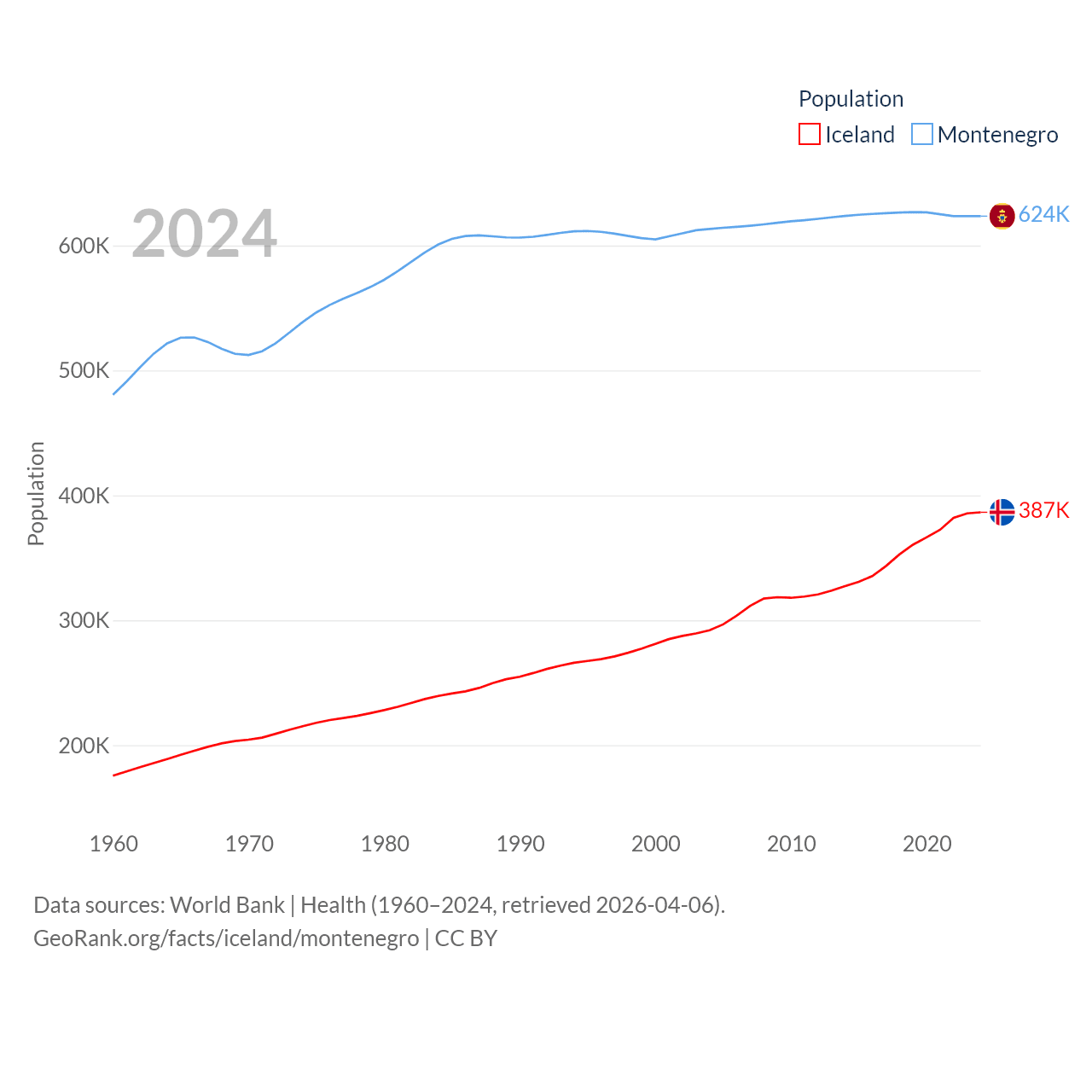 Iceland has a population of 387K (ranked 173/197), compared with 624K in Montenegro (ranked 166/197). Iceland's land area is 38,931 sq mi versus 5,193 sq mi for Montenegro (ranked 104th vs. 156th).