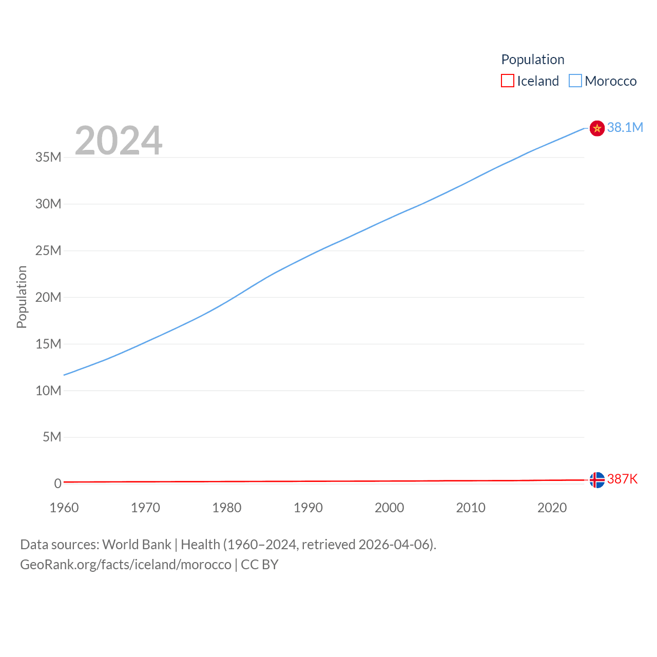 Iceland has a population of 387K (ranked 173/197), compared with 38.1M in Morocco (ranked 39/197). Iceland's land area is 38,931 sq mi versus 172,317 sq mi for Morocco (ranked 104th vs. 55th).