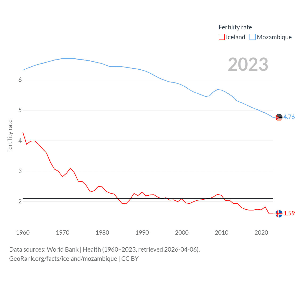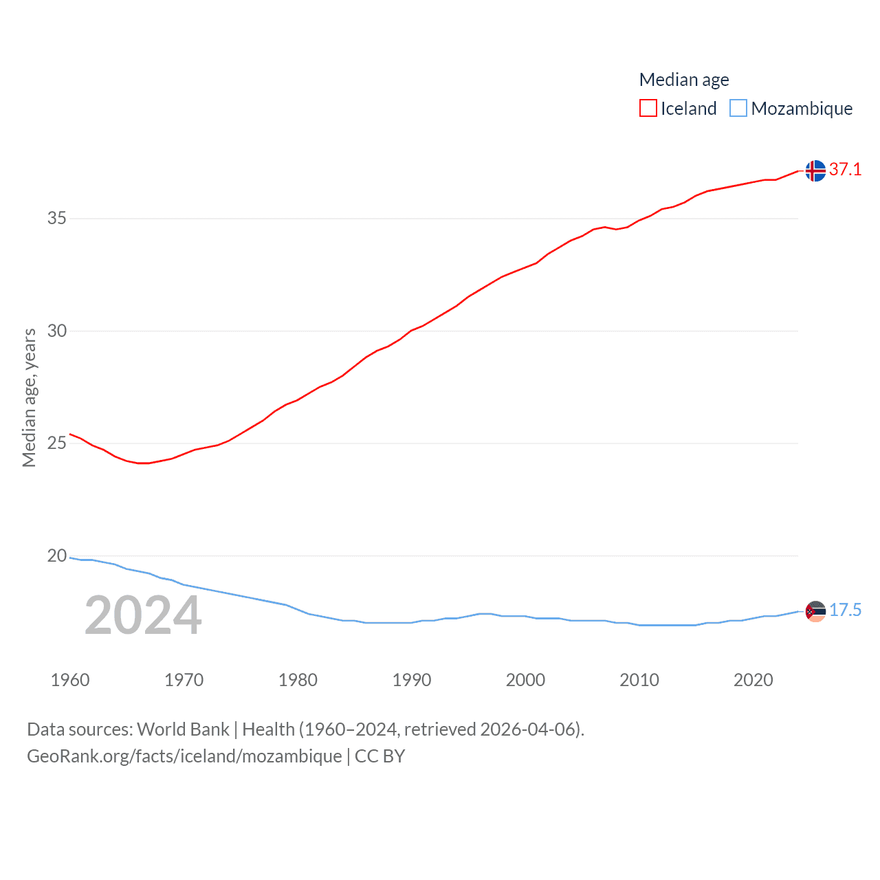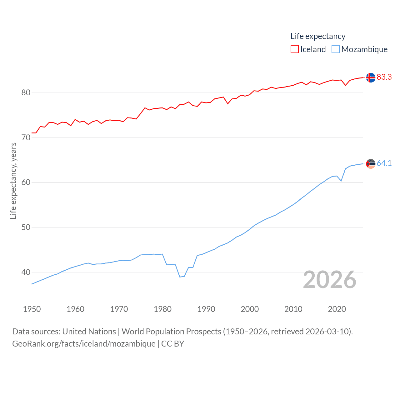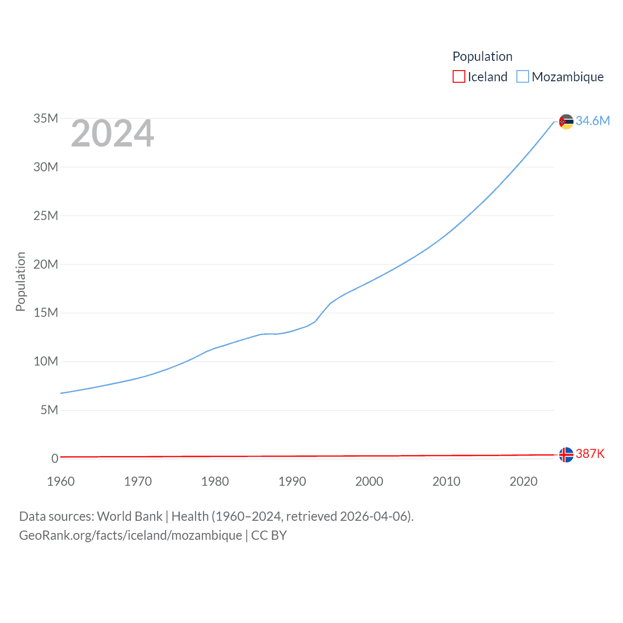 Iceland has a population of 387K (ranked 173/197), compared with 34.6M in Mozambique (ranked 46/197). Iceland's land area is 38,931 sq mi versus 303,623 sq mi for Mozambique (ranked 104th vs. 34th).