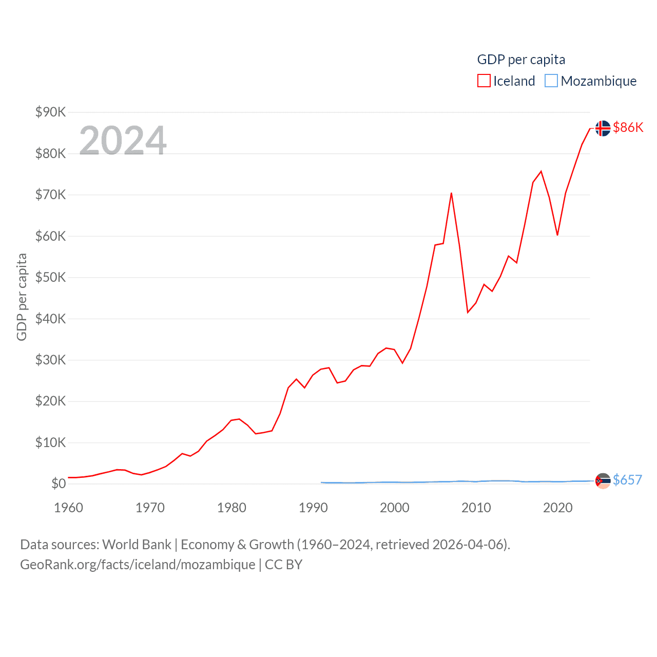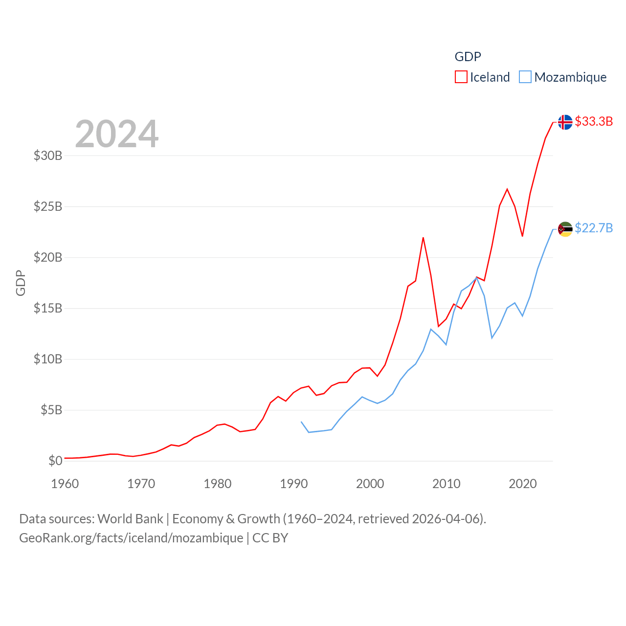 By GDP, Iceland ranks 108/197 ($33.3B) and Mozambique ranks 123/197 ($22.7B). By GDP per capita, Iceland ranks 9/197 ($86,041), while Mozambique ranks 189/197 ($657).
