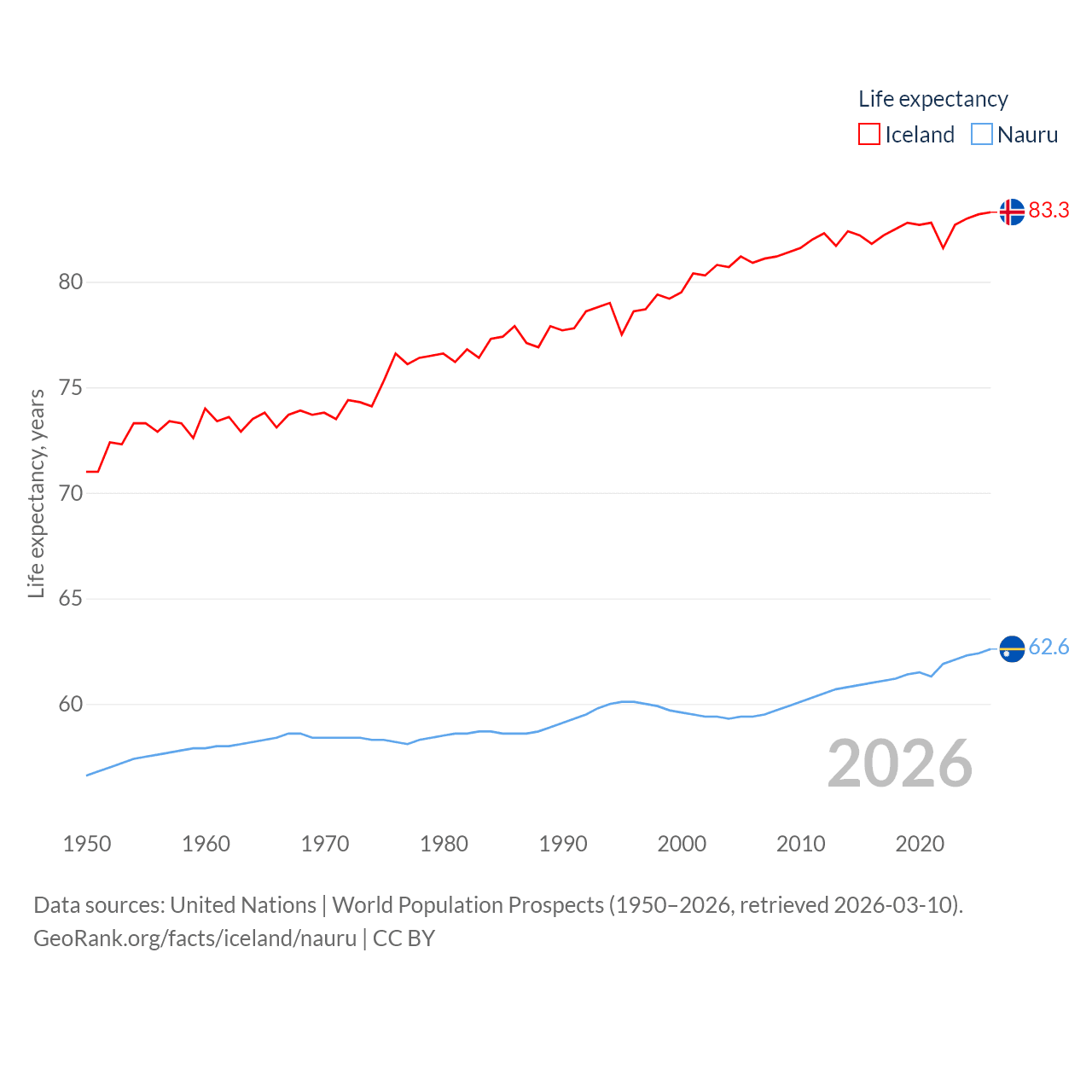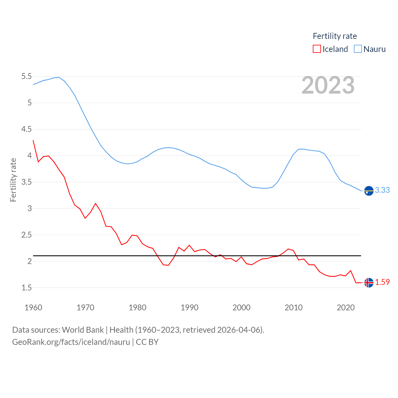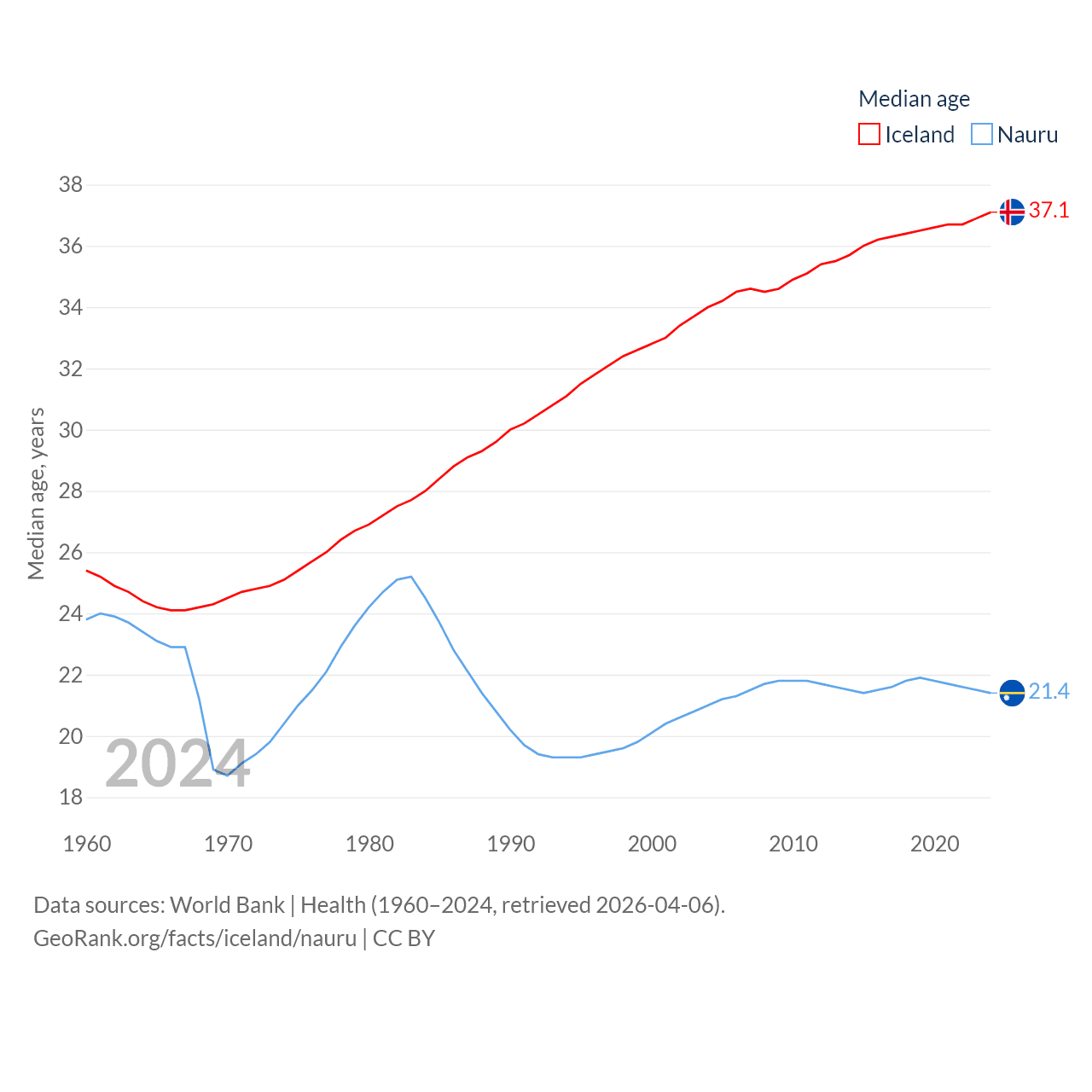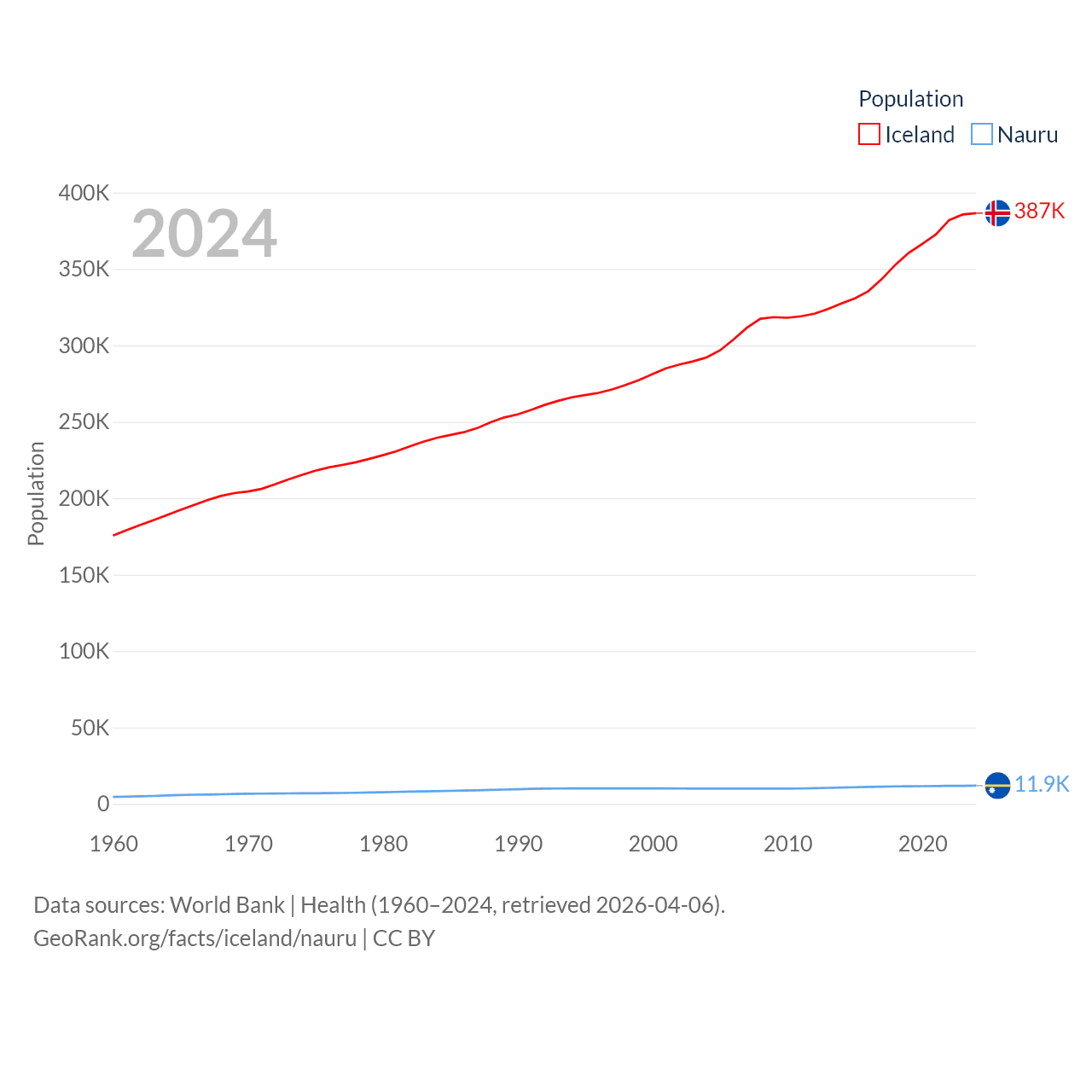Iceland has a population of 387K (ranked 173/197), compared with 11.9K in Nauru (ranked 195/197). Iceland's land area is 38,931 sq mi versus 7.72 sq mi for Nauru (ranked 104th vs. 195th).
