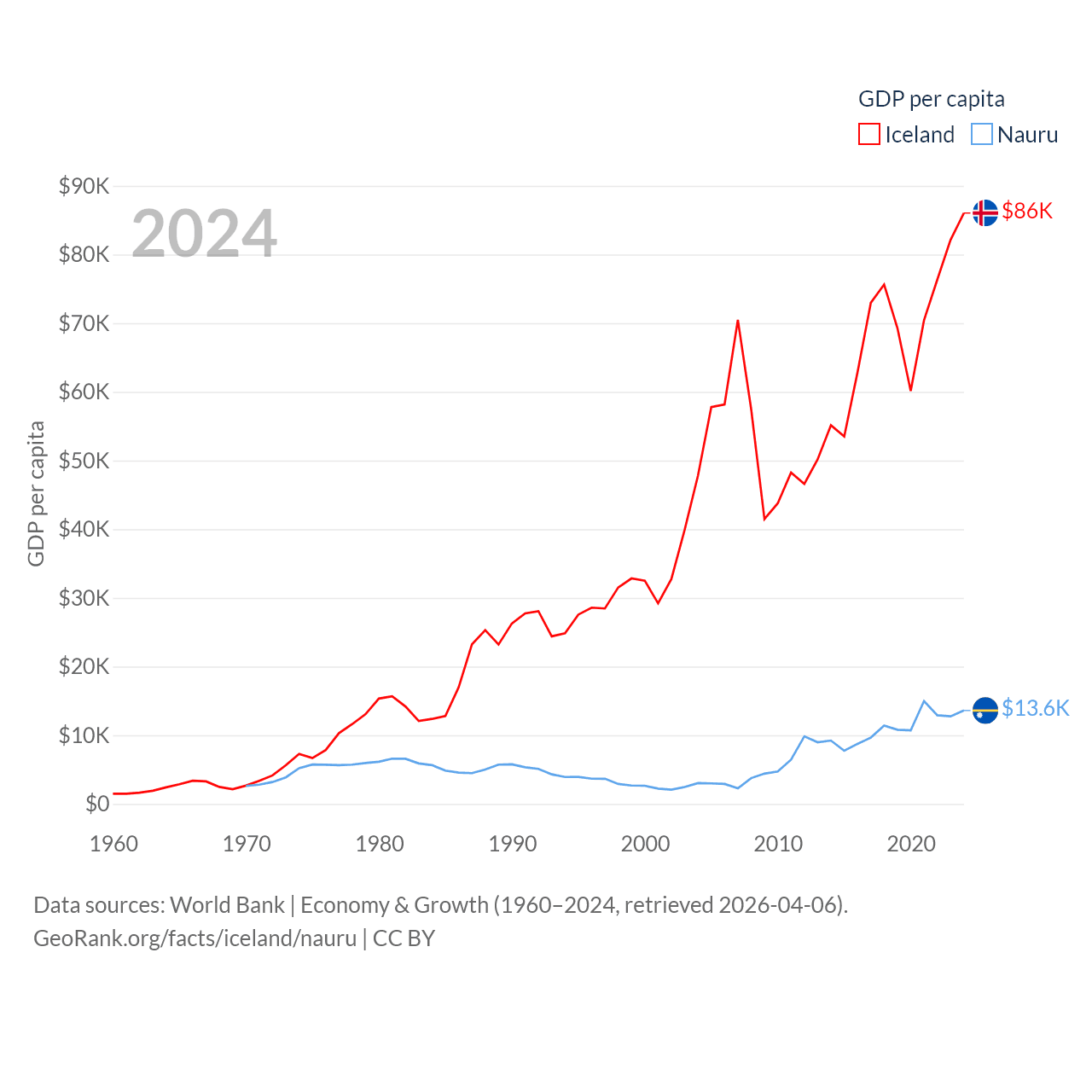 By GDP, Iceland ranks 108/197 ($33.3B) and Nauru ranks 195/197 ($163M). By GDP per capita, Iceland ranks 9/197 ($86,041), while Nauru ranks 74/197 ($13,609).