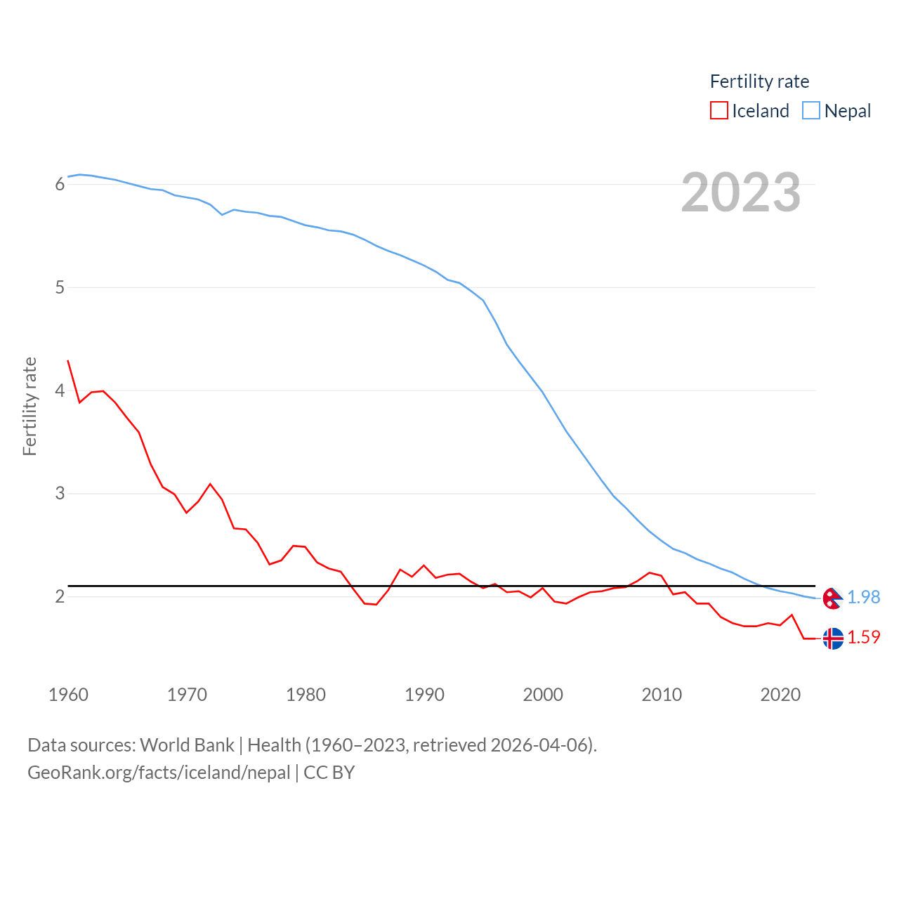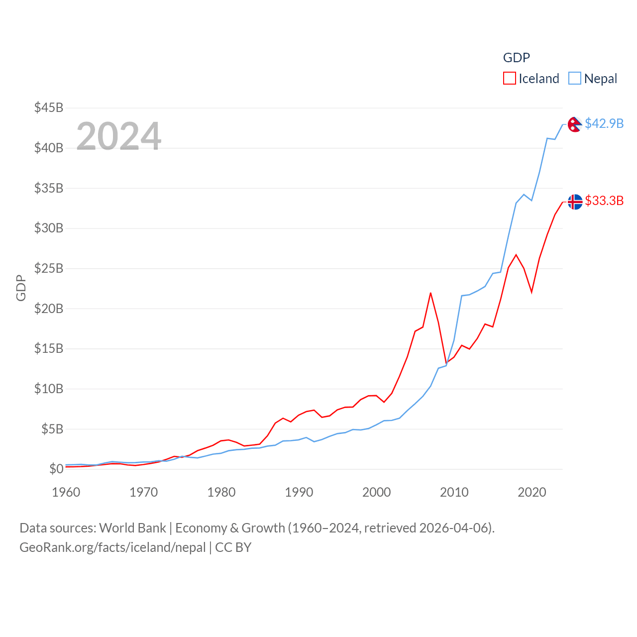 By GDP, Iceland ranks 108/197 ($33.3B) and Nepal ranks 101/197 ($42.9B). By GDP per capita, Iceland ranks 9/197 ($86,041), while Nepal ranks 164/197 ($1,447).