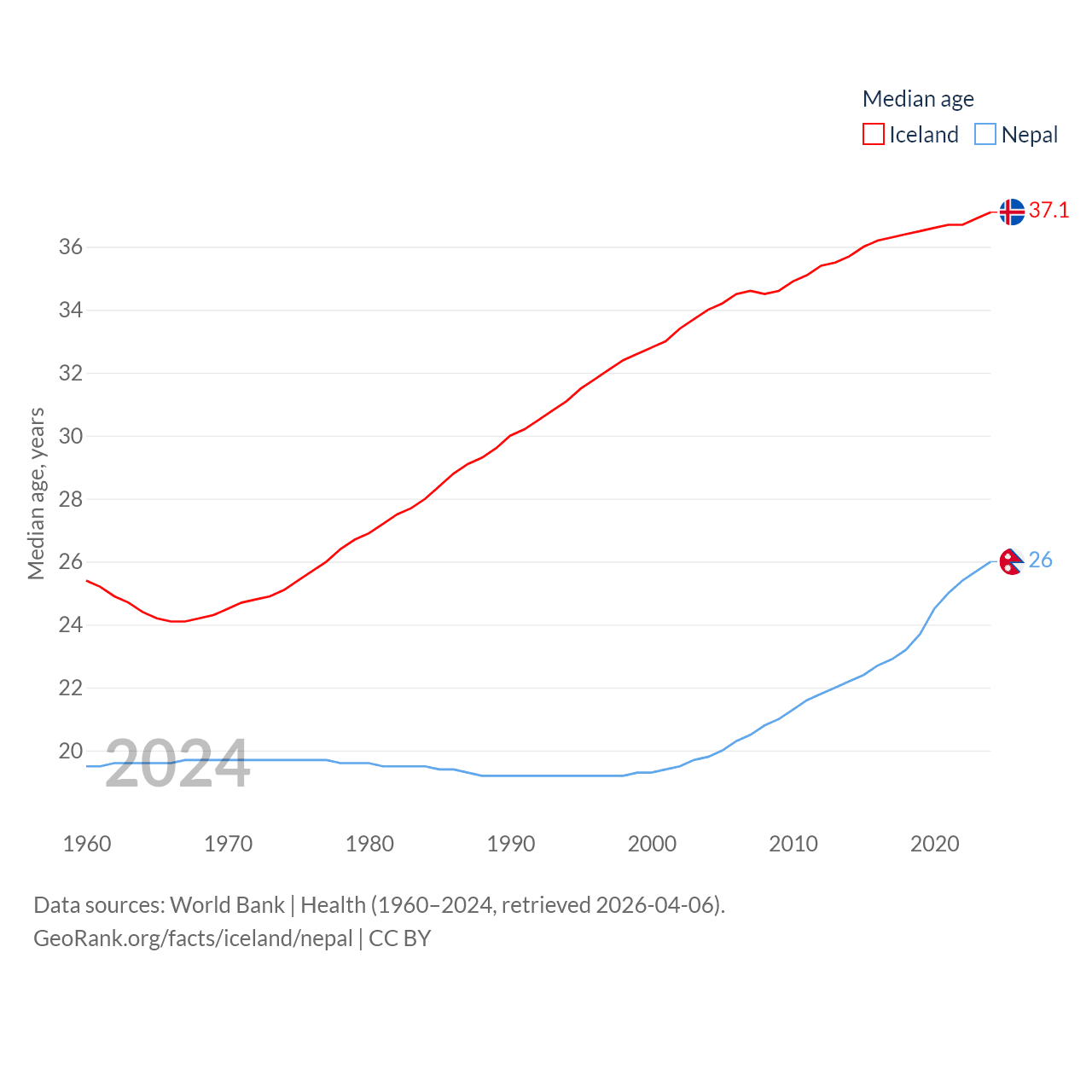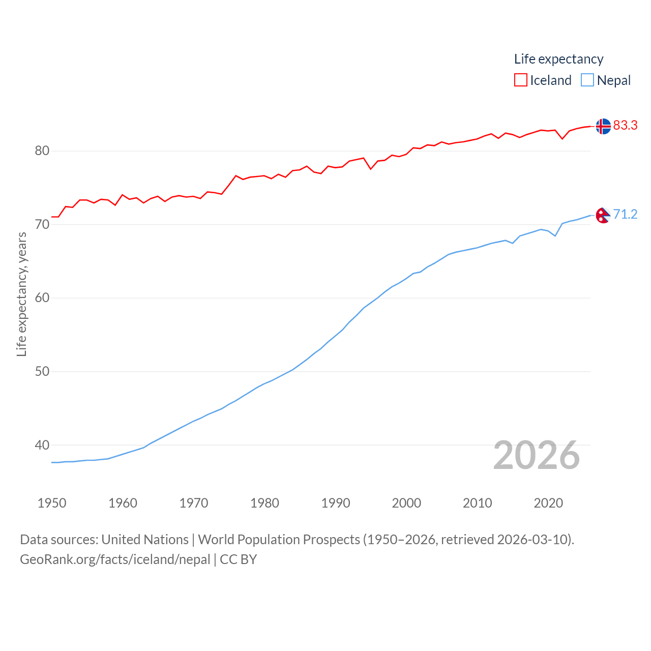 Iceland has a population of 387K (ranked 173/197), compared with 29.7M in Nepal (ranked 51/197). Iceland's land area is 38,931 sq mi versus 55,348 sq mi for Nepal (ranked 104th vs. 92nd).