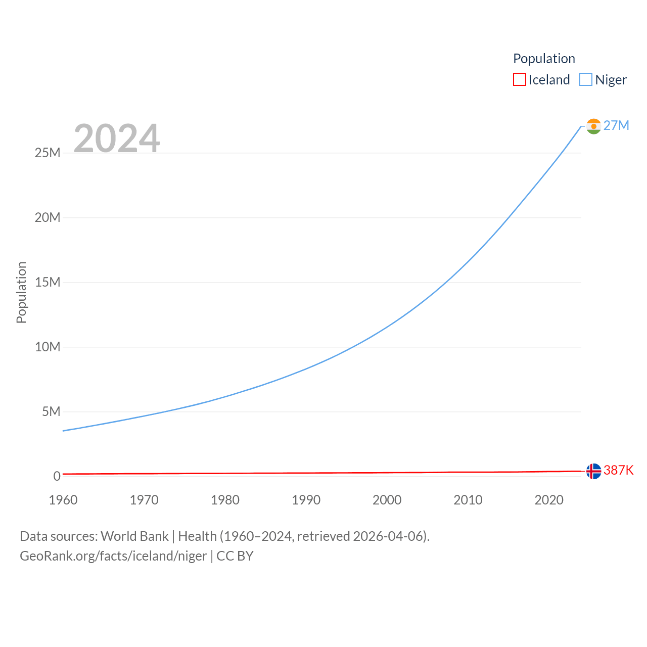 Iceland has a population of 387K (ranked 173/197), compared with 27M in Niger (ranked 55/197). Iceland's land area is 38,931 sq mi versus 489,076 sq mi for Niger (ranked 104th vs. 20th).