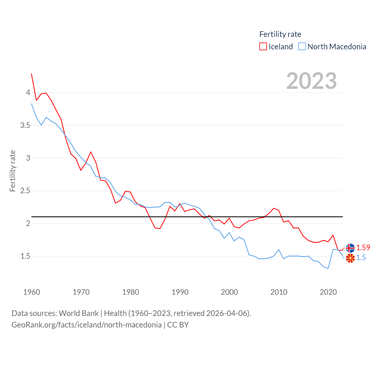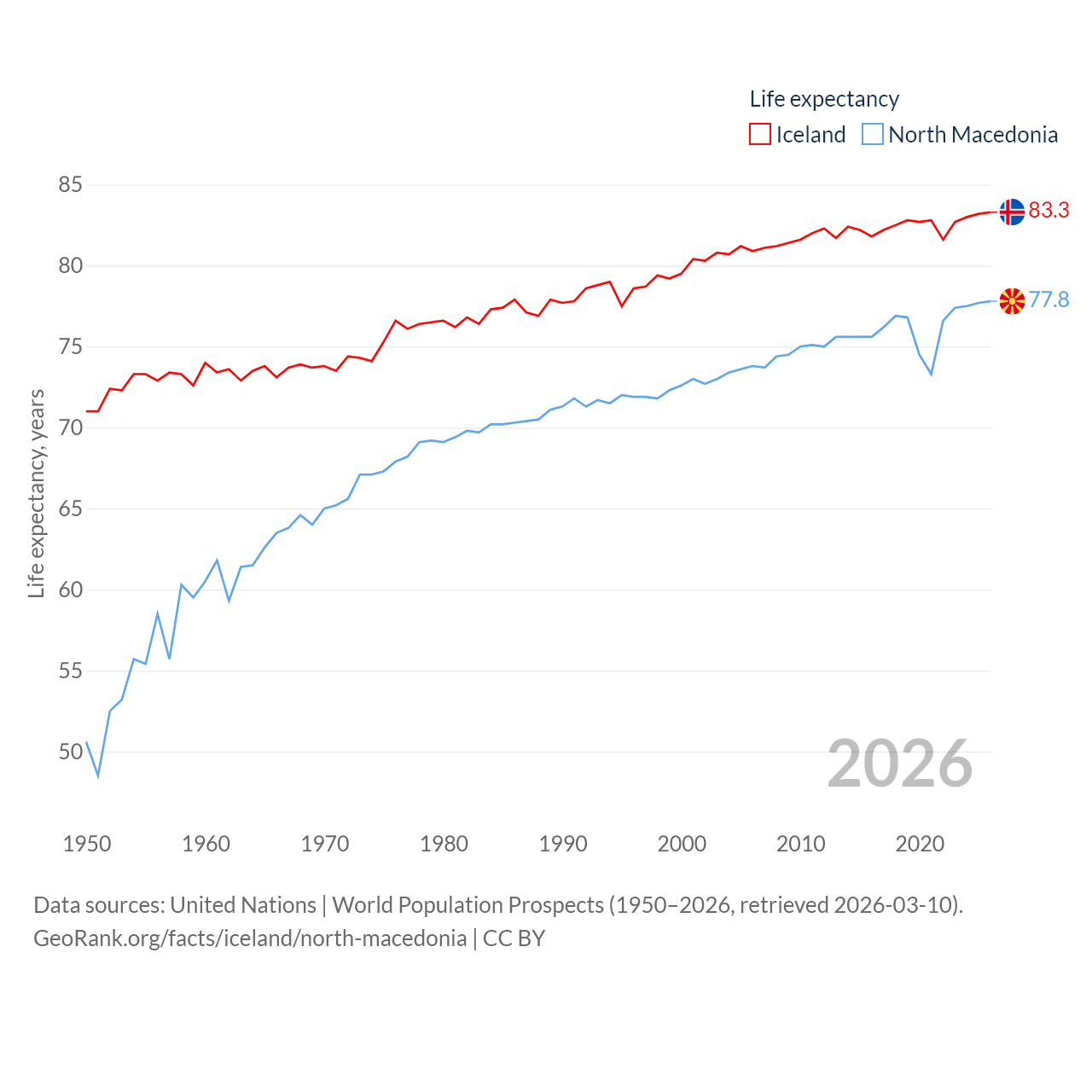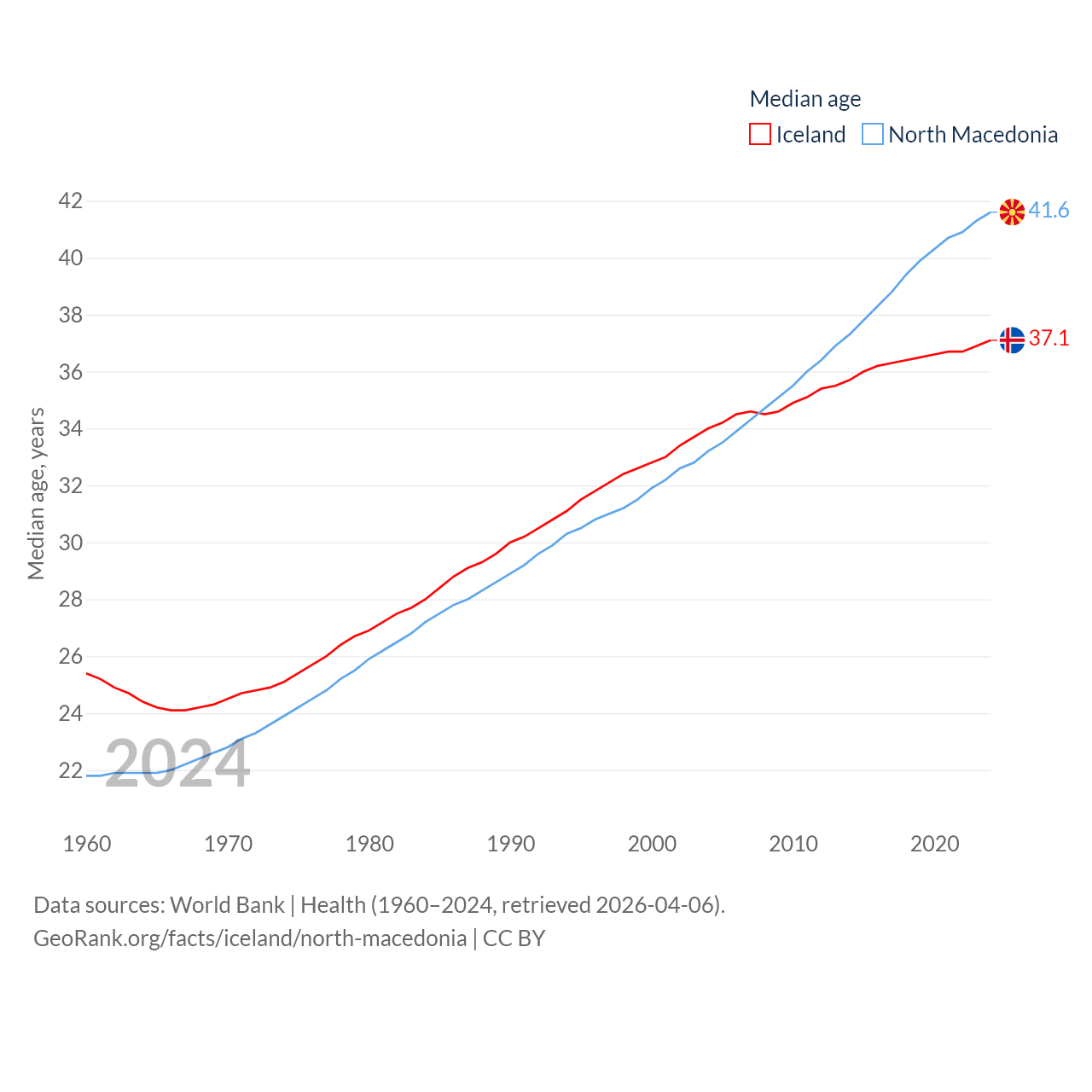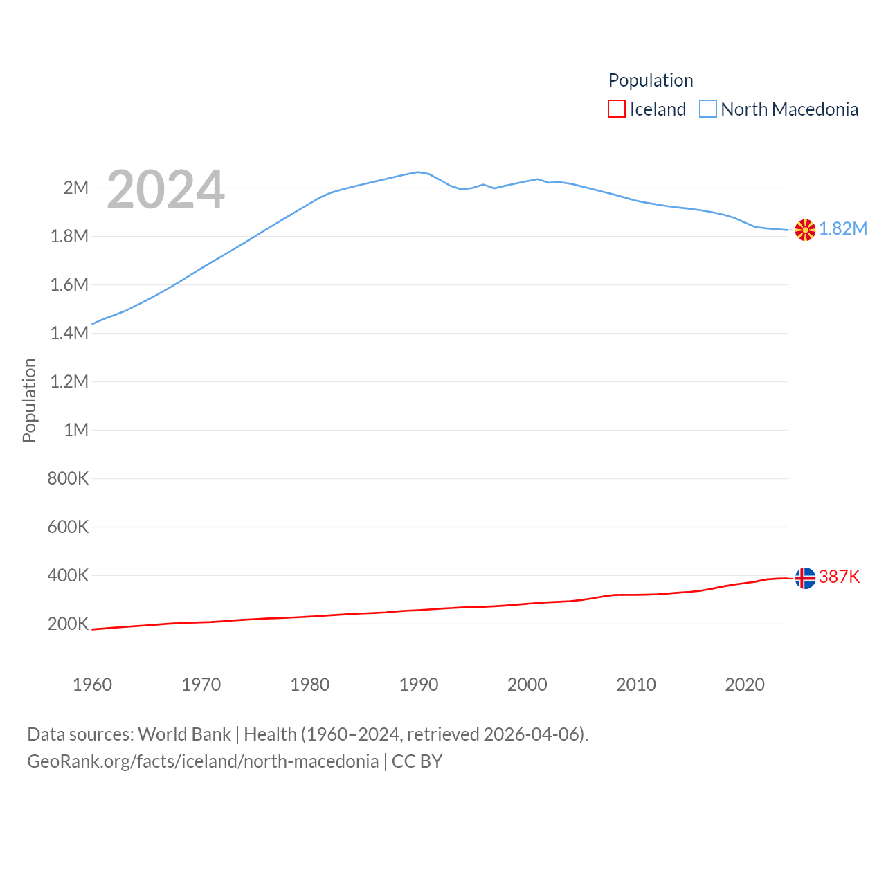 Iceland has a population of 387K (ranked 173/197), compared with 1.82M in North Macedonia (ranked 150/197). Iceland's land area is 38,931 sq mi versus 9,737 sq mi for North Macedonia (ranked 104th vs. 145th).