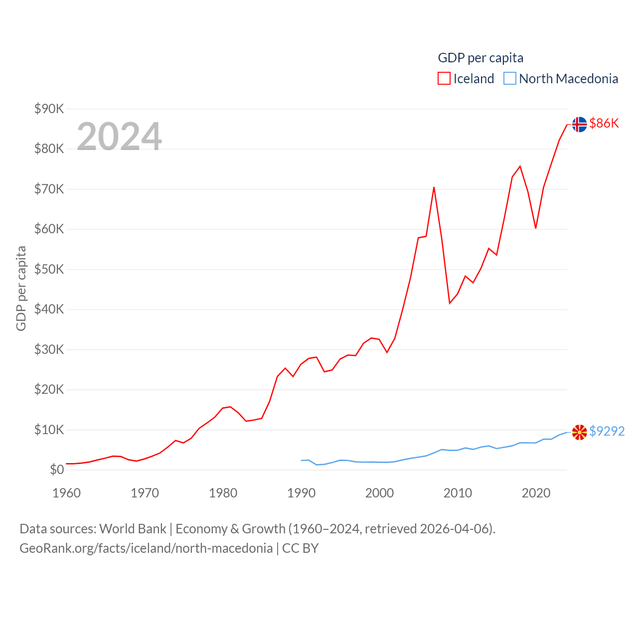 By GDP, Iceland ranks 108/197 ($33.3B) and North Macedonia ranks 138/197 ($17B). By GDP per capita, Iceland ranks 9/197 ($86,041), while North Macedonia ranks 88/197 ($9,292).