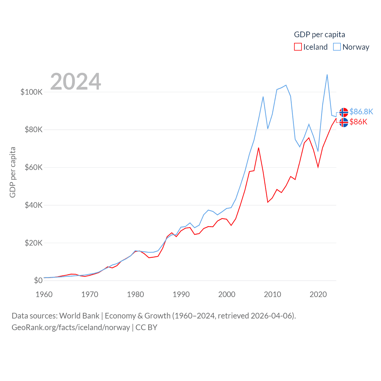 By GDP, Iceland ranks 108/197 ($33.3B) and Norway ranks 32/197 ($484B). By GDP per capita, Iceland ranks 9/197 ($86,041), while Norway ranks 8/197 ($86,785).