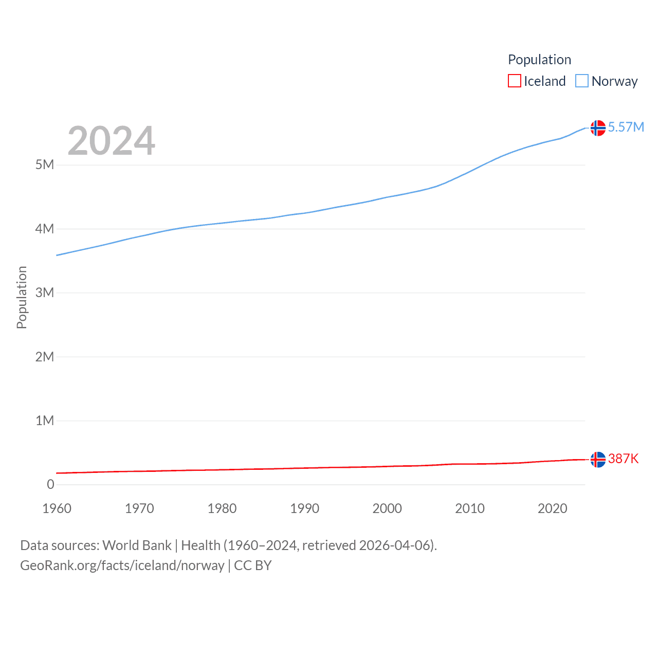 Iceland has a population of 387K (ranked 173/197), compared with 5.57M in Norway (ranked 118/197). Iceland's land area is 38,931 sq mi versus 140,645 sq mi for Norway (ranked 104th vs. 62nd).