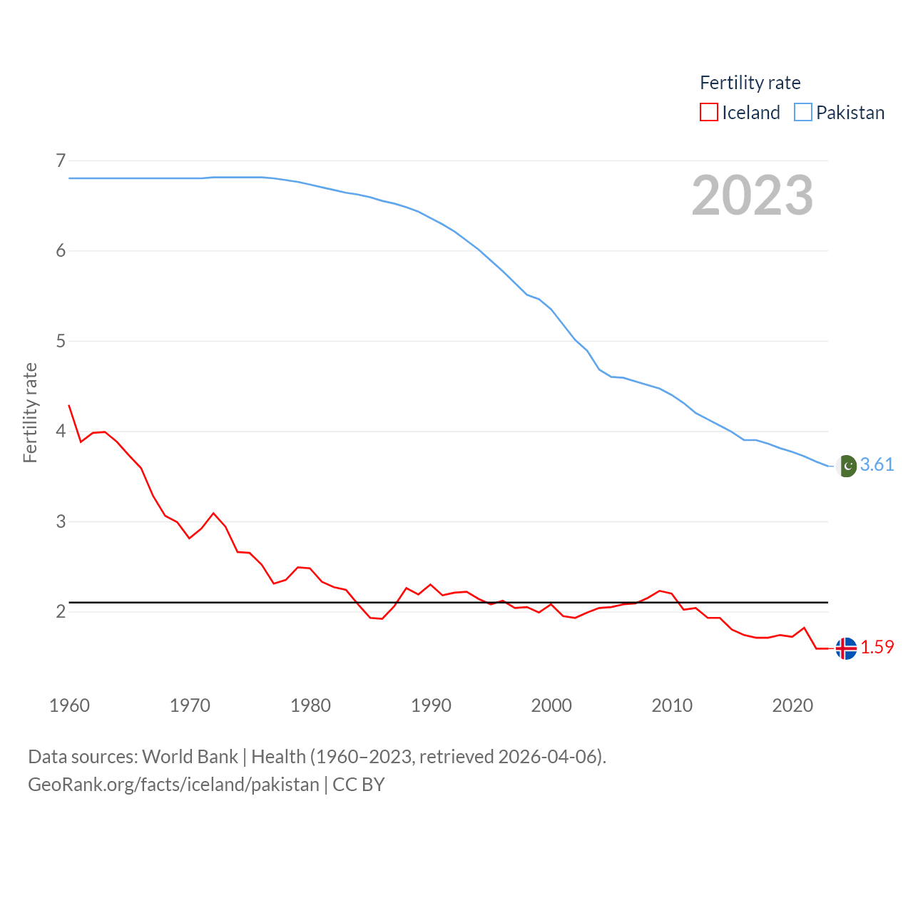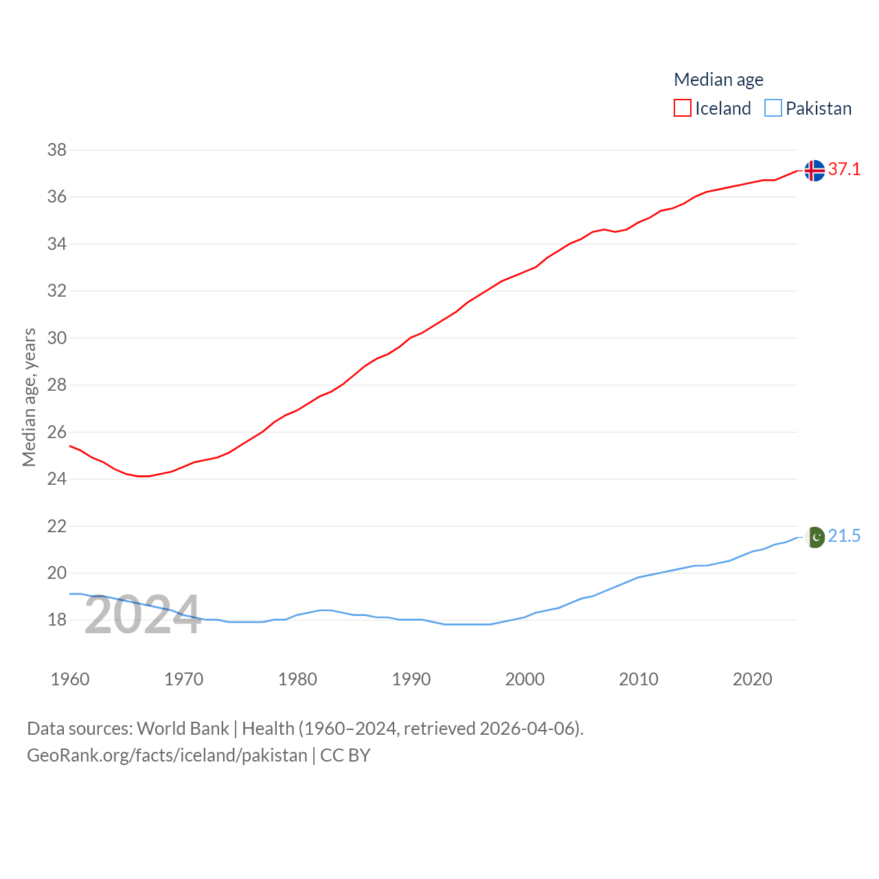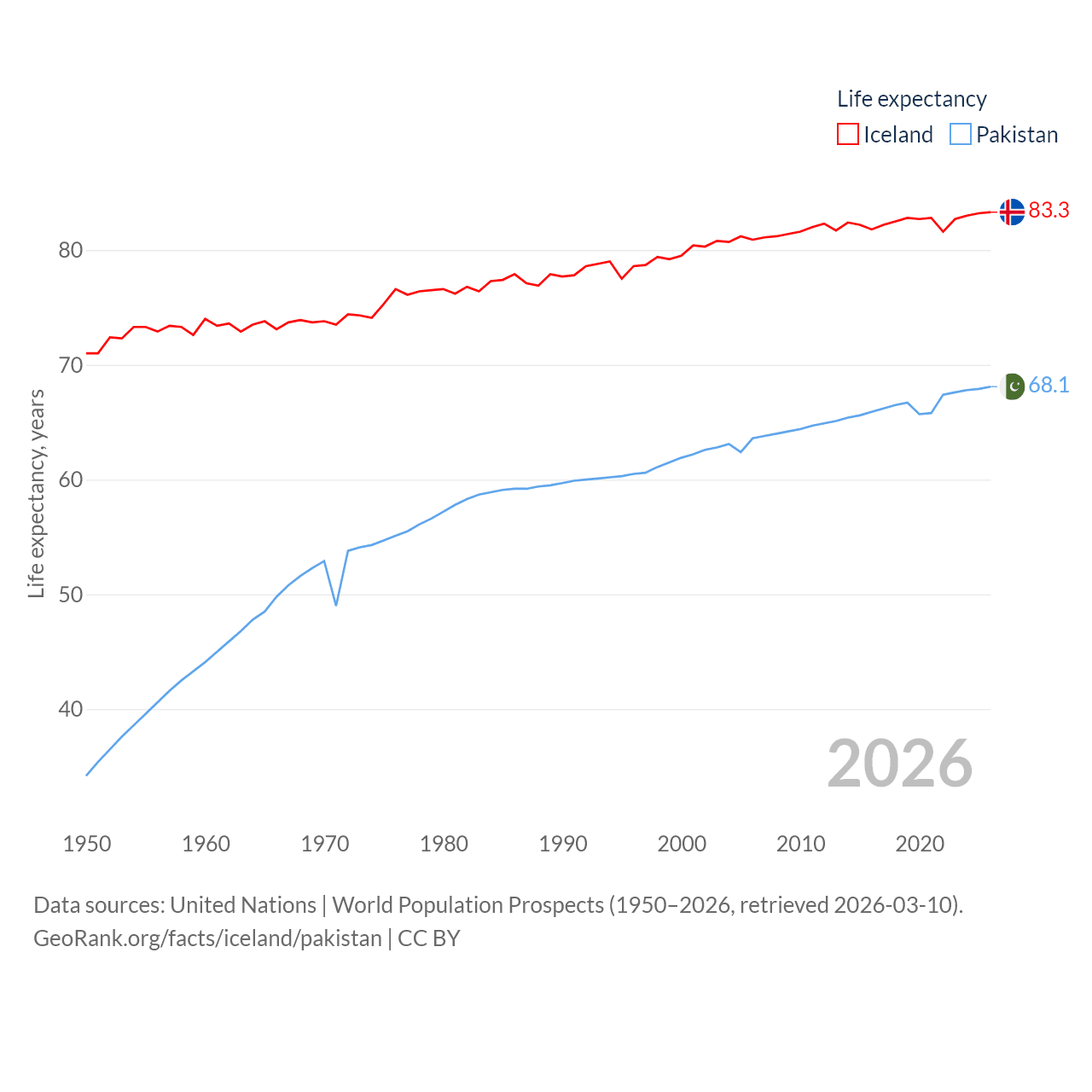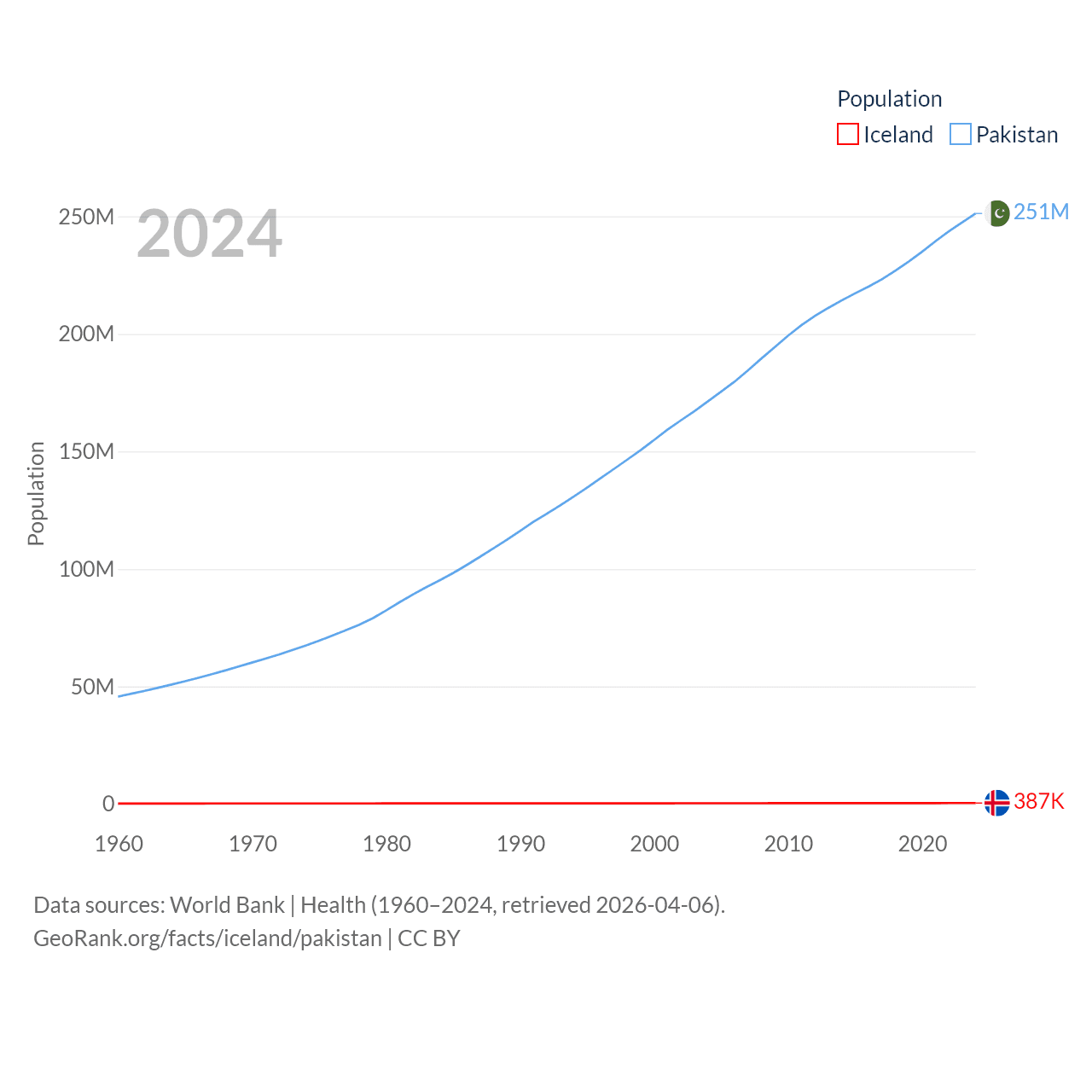 Iceland has a population of 387K (ranked 173/197), compared with 251M in Pakistan (ranked 5/197). Iceland's land area is 38,931 sq mi versus 297,638 sq mi for Pakistan (ranked 104th vs. 35th).