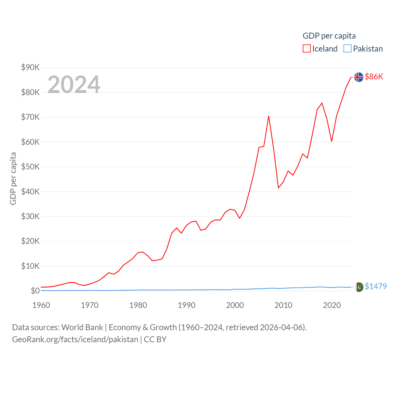 By GDP, Iceland ranks 108/197 ($33.3B) and Pakistan ranks 43/197 ($372B). By GDP per capita, Iceland ranks 9/197 ($86,041), while Pakistan ranks 163/197 ($1,479).