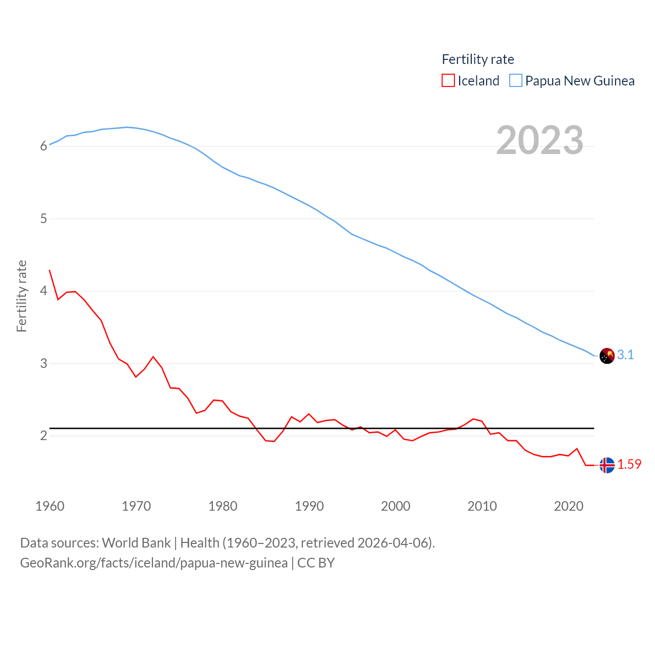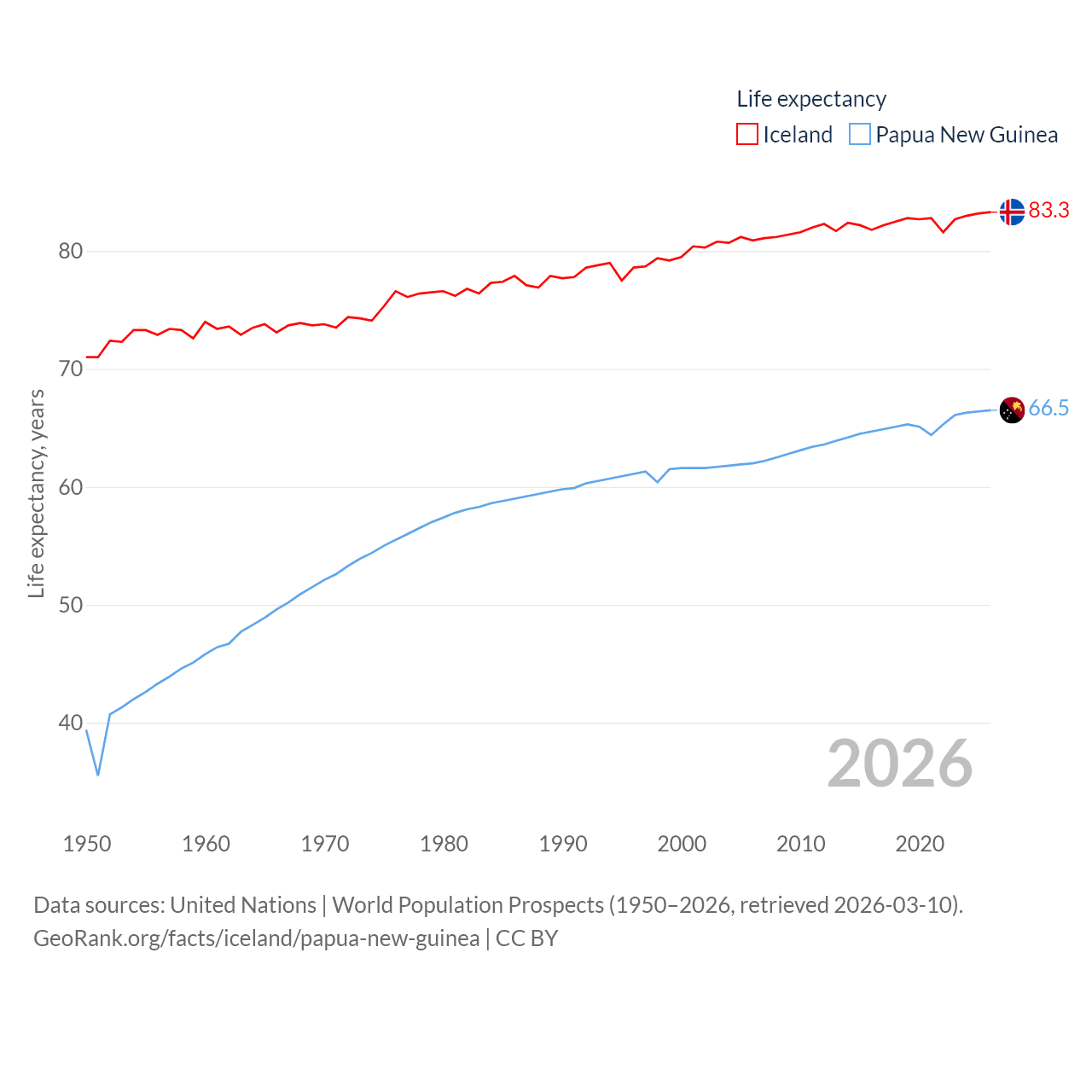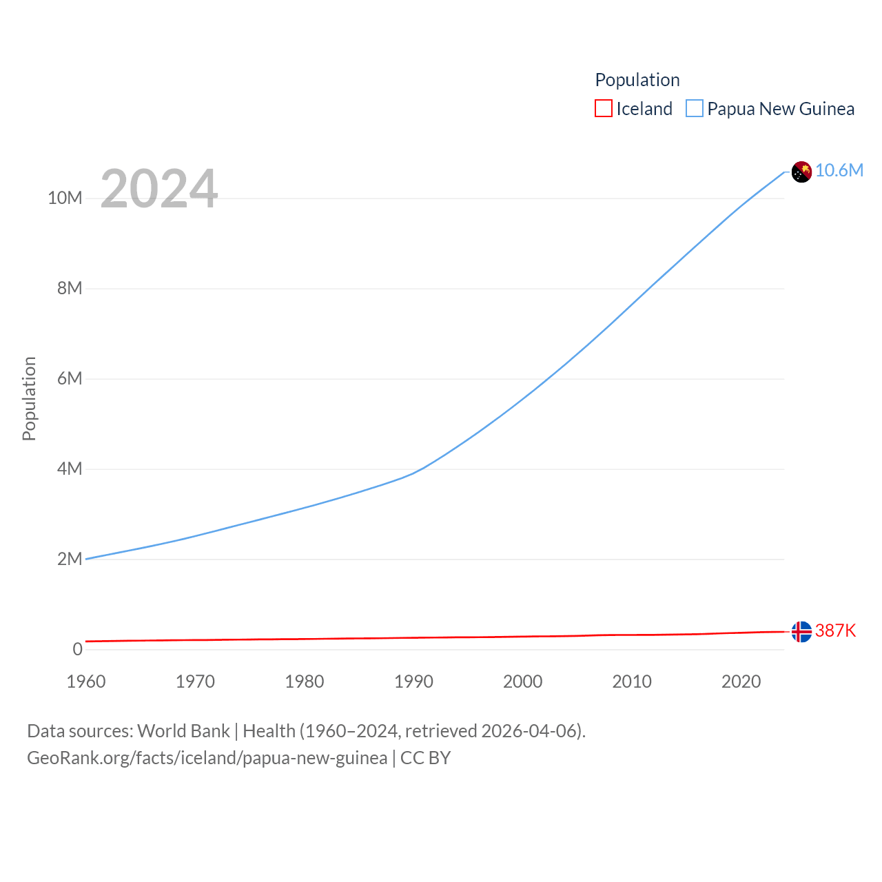 Iceland has a population of 387K (ranked 173/197), compared with 10.6M in Papua New Guinea (ranked 92/197). Iceland's land area is 38,931 sq mi versus 174,850 sq mi for Papua New Guinea (ranked 104th vs. 54th).