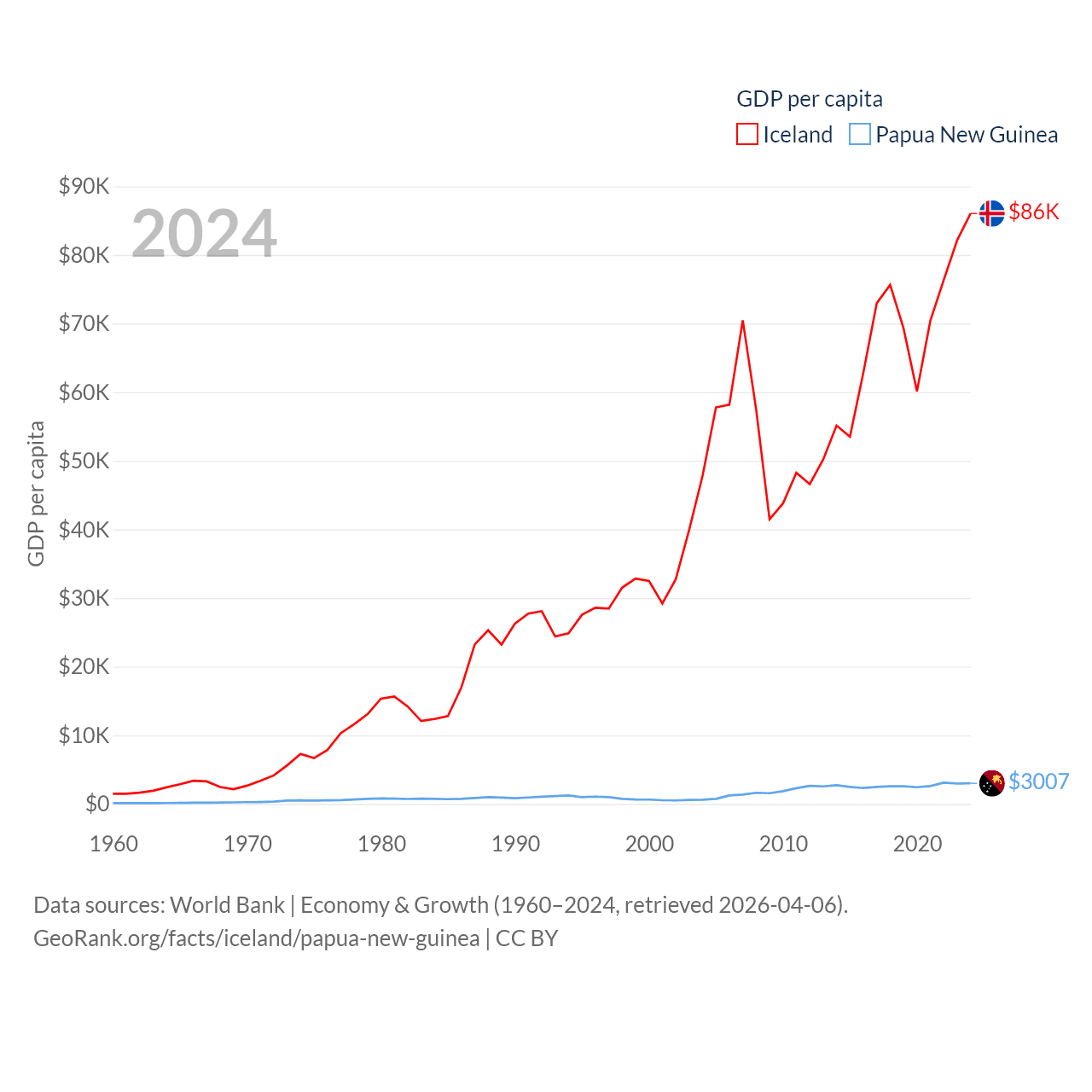 By GDP, Iceland ranks 108/197 ($33.3B) and Papua New Guinea ranks 110/197 ($31.8B). By GDP per capita, Iceland ranks 9/197 ($86,041), while Papua New Guinea ranks 140/197 ($3,007).