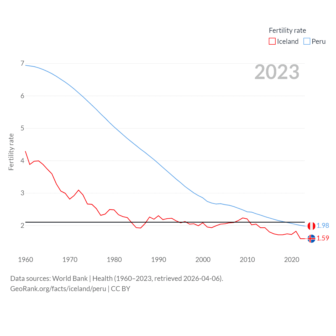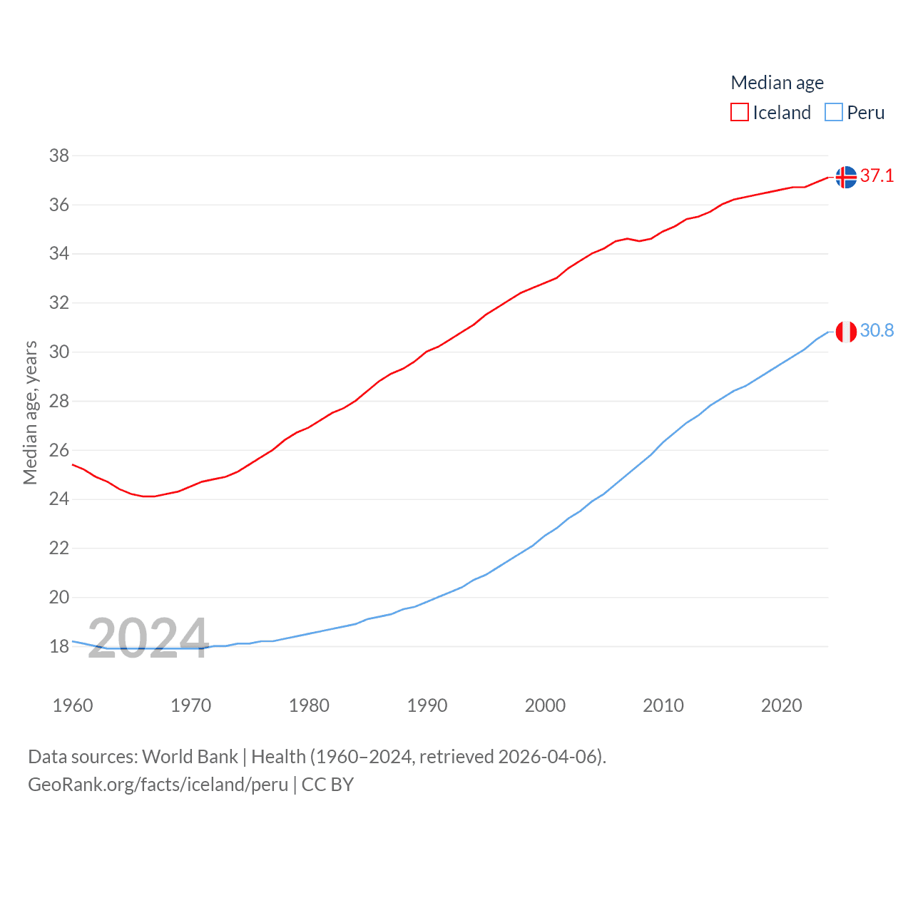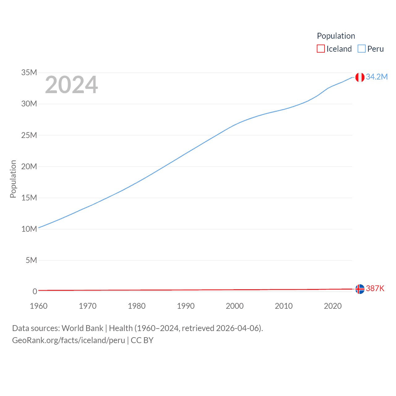 Iceland has a population of 387K (ranked 173/197), compared with 34.2M in Peru (ranked 48/197). Iceland's land area is 38,931 sq mi versus 494,211 sq mi for Peru (ranked 104th vs. 19th).