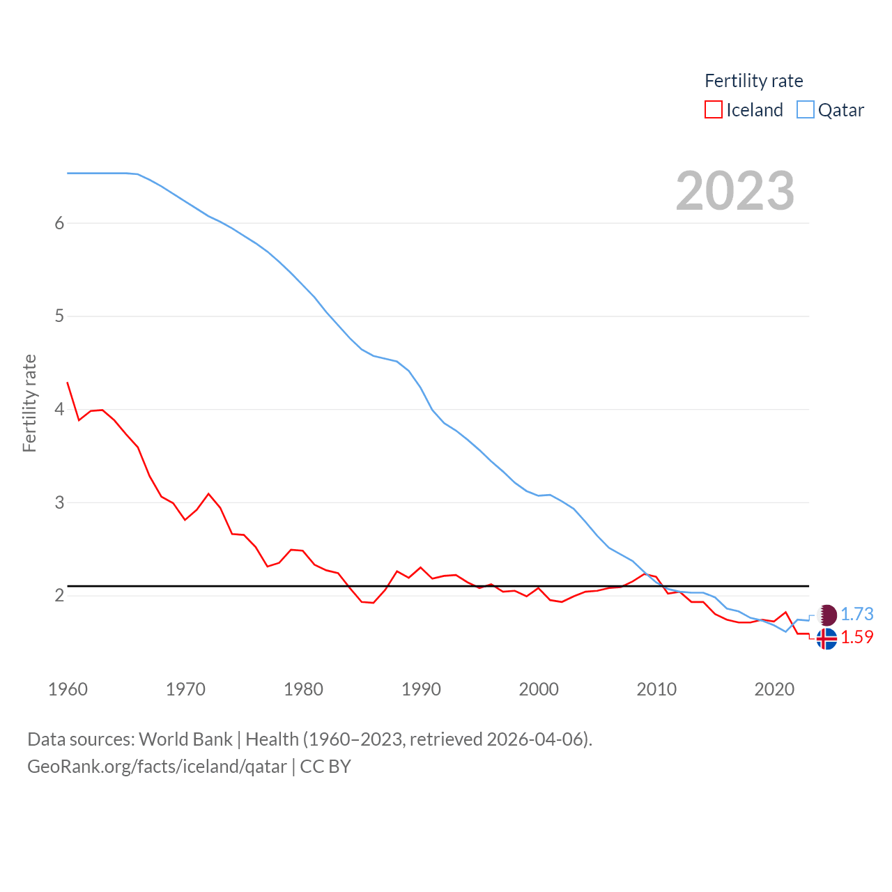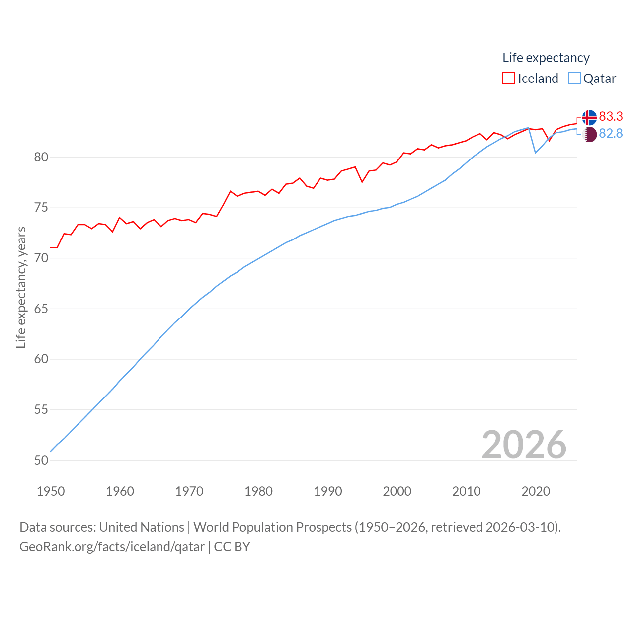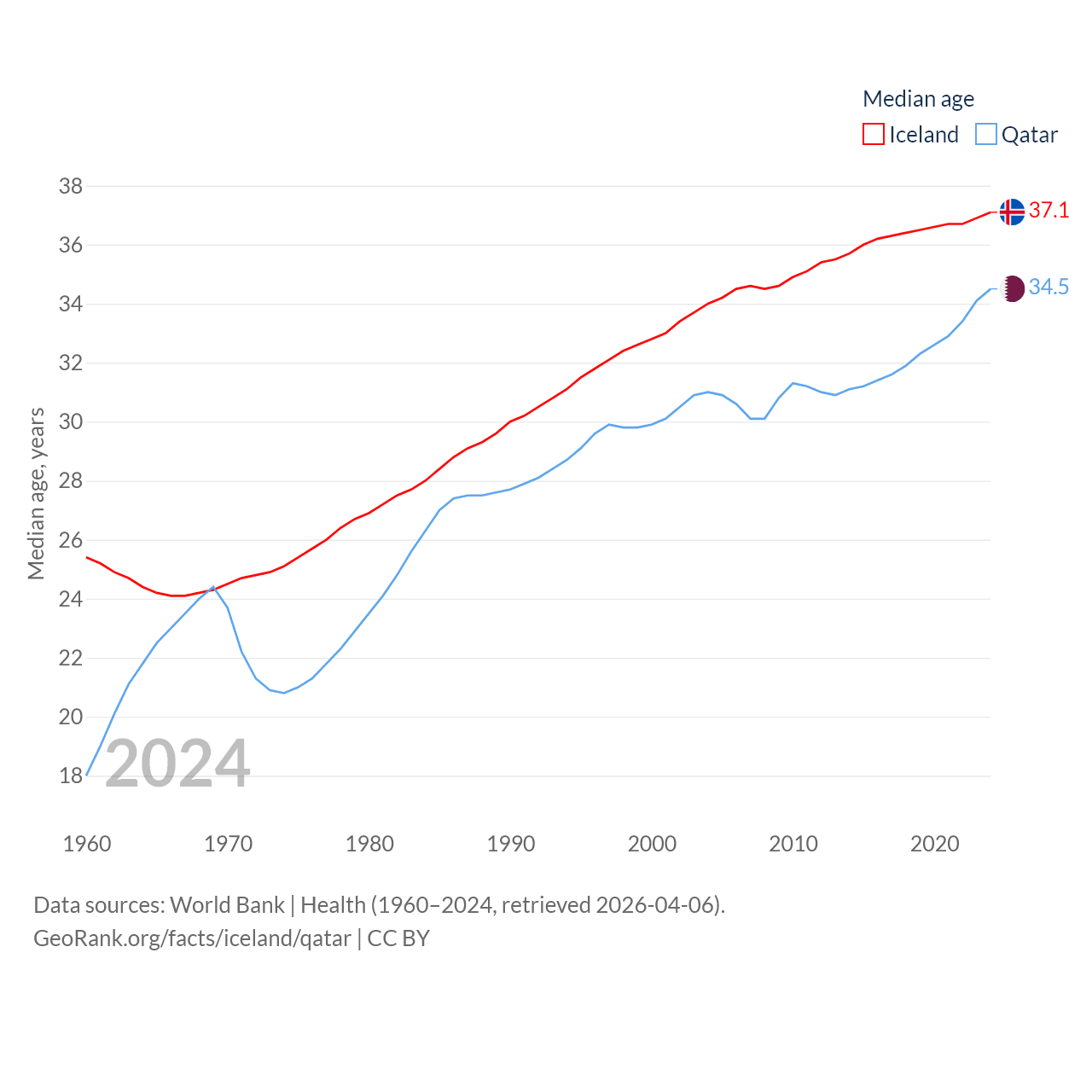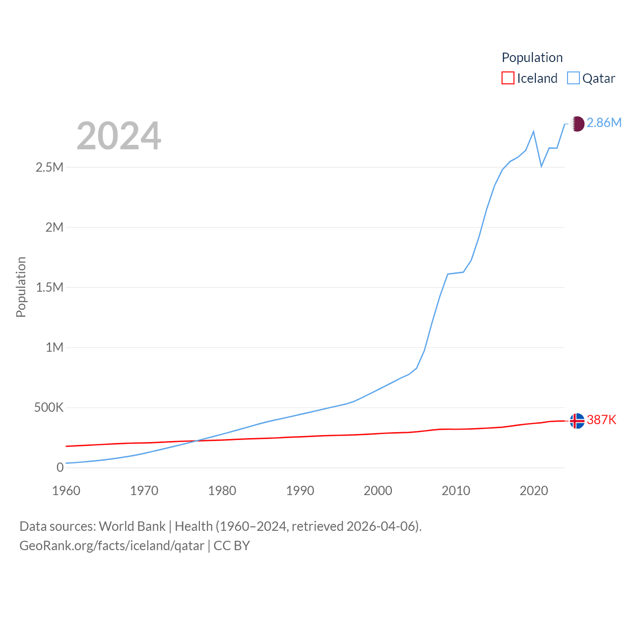 Iceland has a population of 387K (ranked 173/197), compared with 2.86M in Qatar (ranked 138/197). Iceland's land area is 38,931 sq mi versus 4,436 sq mi for Qatar (ranked 104th vs. 158th).