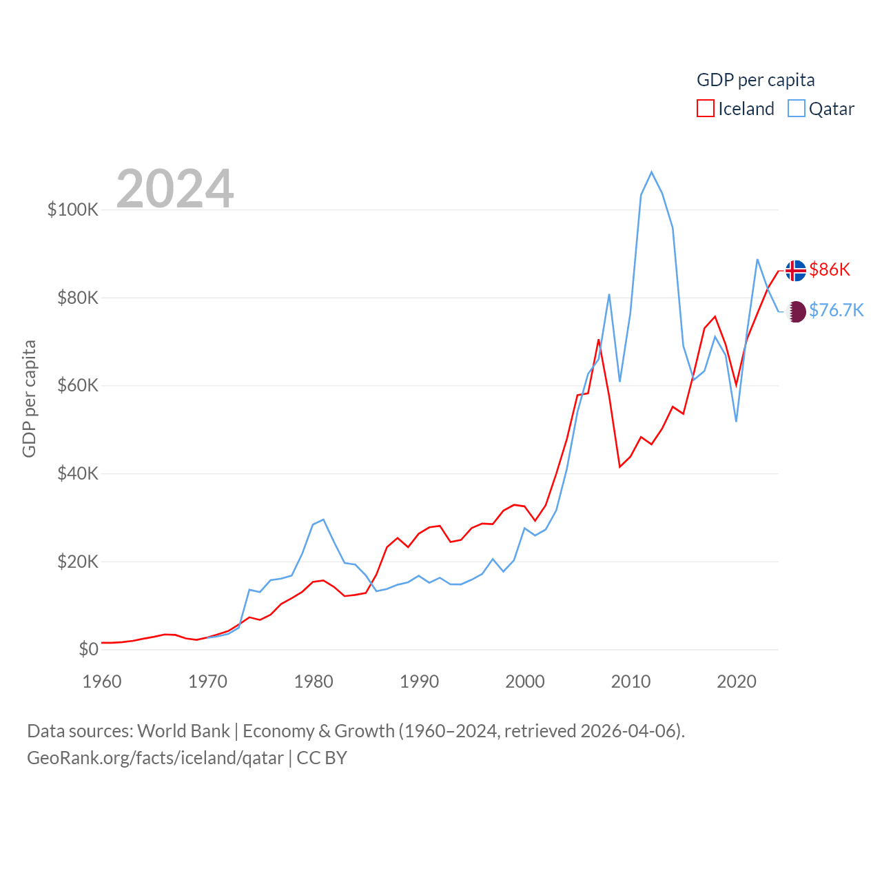 By GDP, Iceland ranks 108/197 ($33.3B) and Qatar ranks 56/197 ($219B). By GDP per capita, Iceland ranks 9/197 ($86,041), while Qatar ranks 11/197 ($76,689).