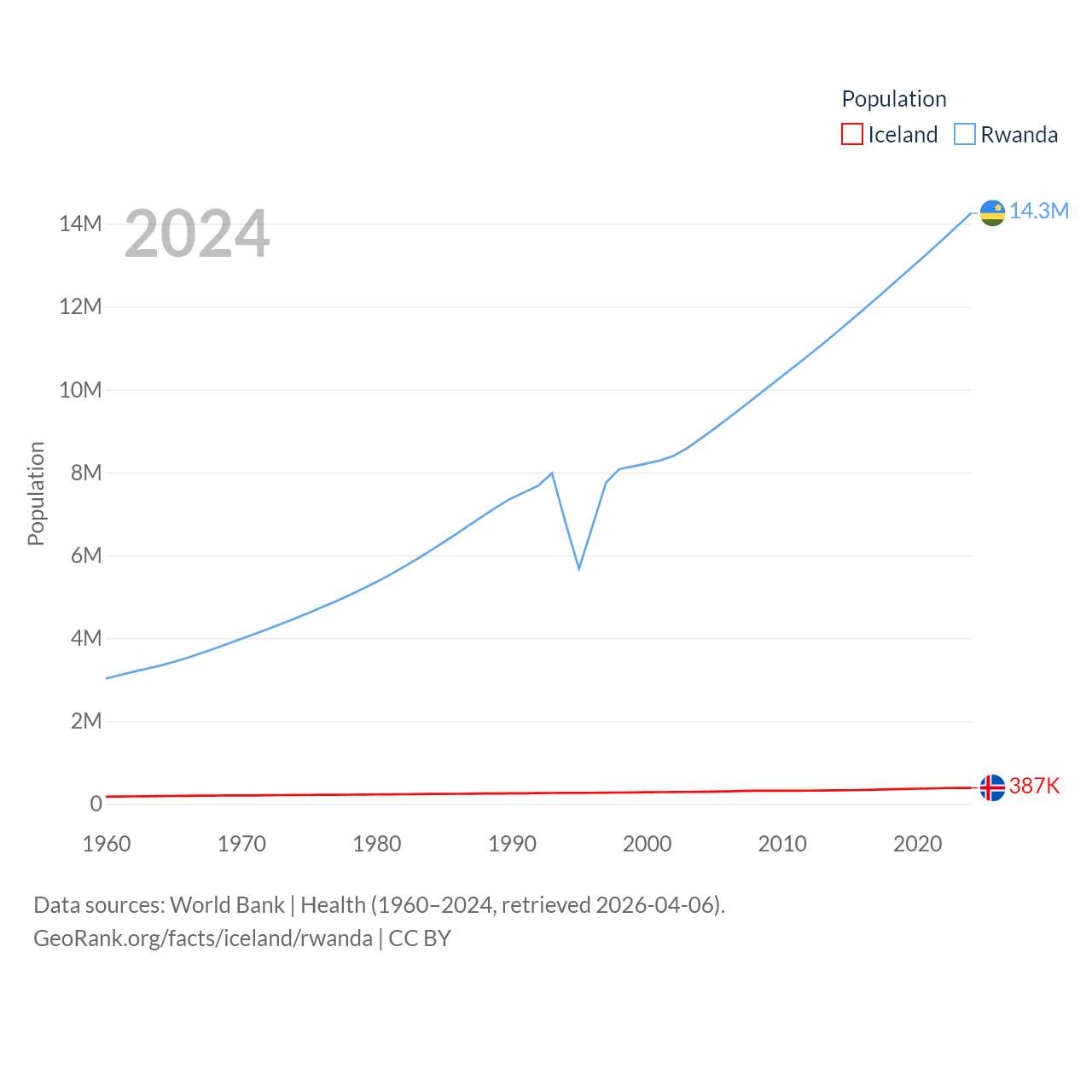 Iceland has a population of 387K (ranked 173/197), compared with 14.3M in Rwanda (ranked 77/197). Iceland's land area is 38,931 sq mi versus 9,525 sq mi for Rwanda (ranked 104th vs. 146th).