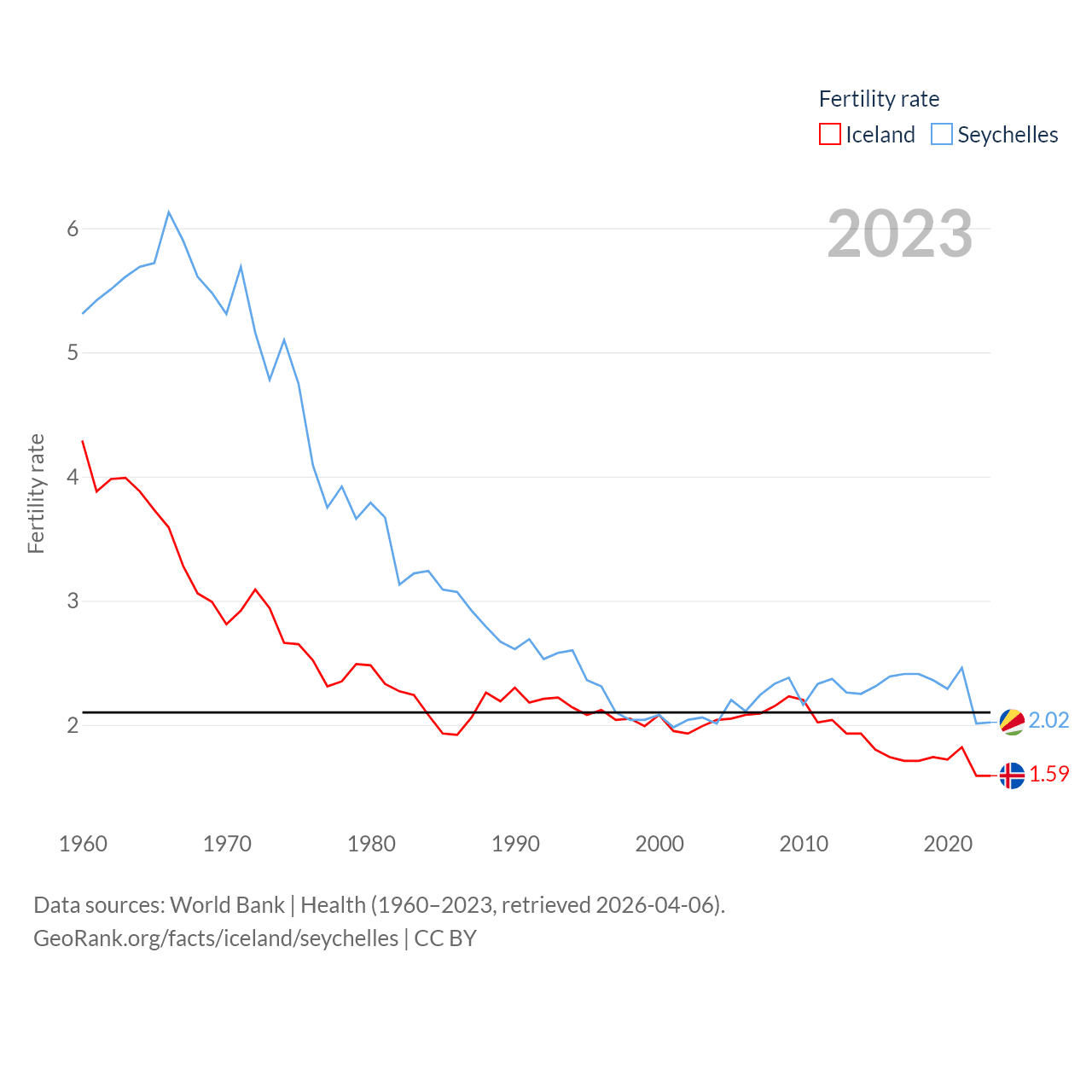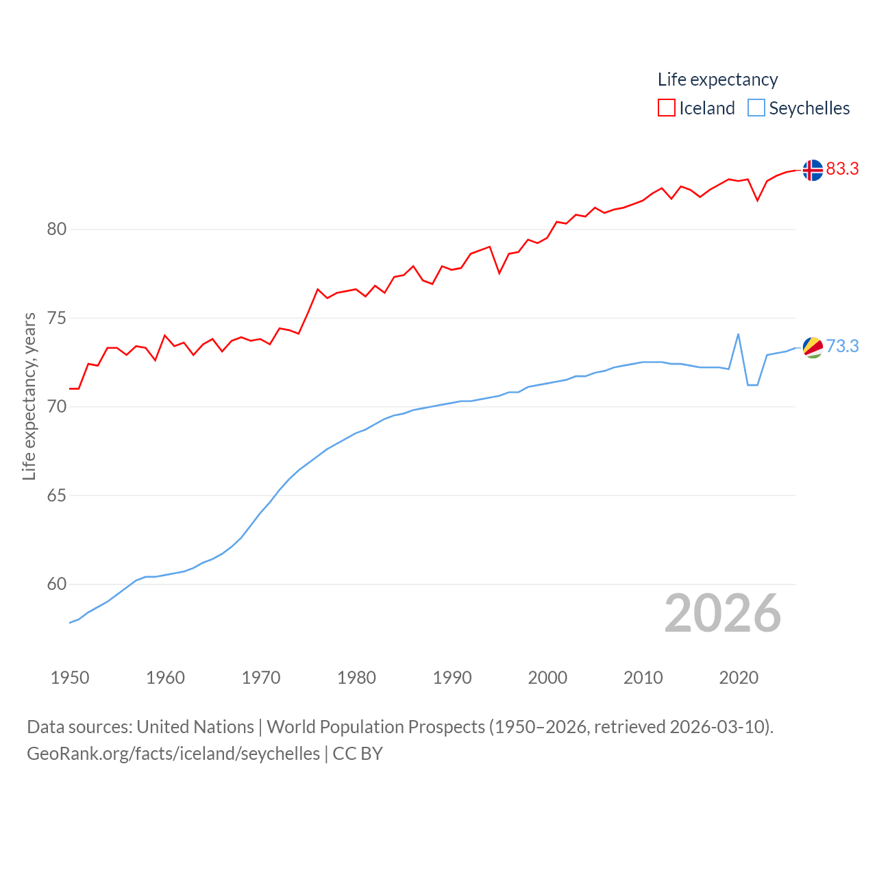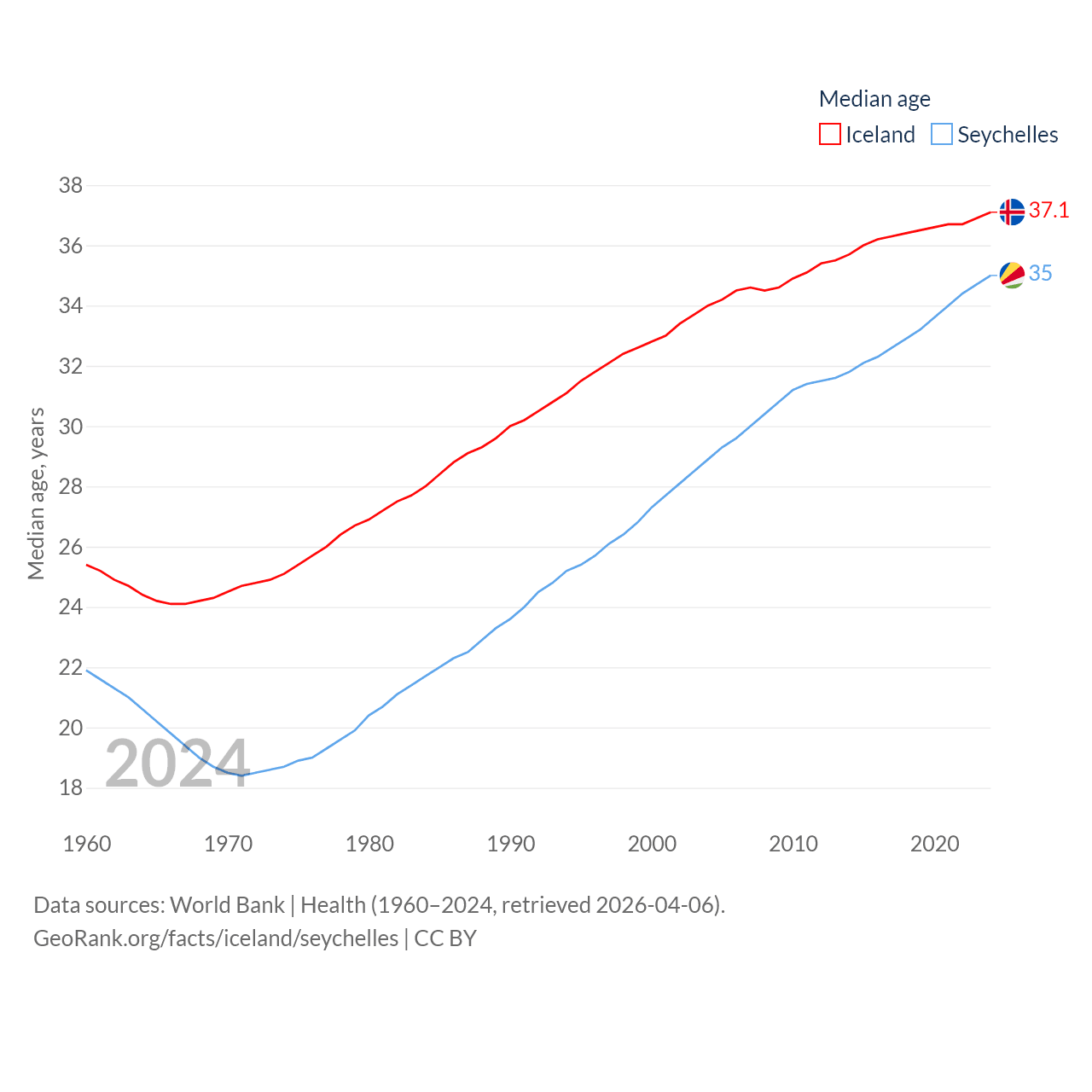 Iceland has a population of 387K (ranked 173/197), compared with 121K in The Seychelles (ranked 181/197). Iceland's land area is 38,931 sq mi versus 177.6 sq mi for The Seychelles (ranked 104th vs. 181st).