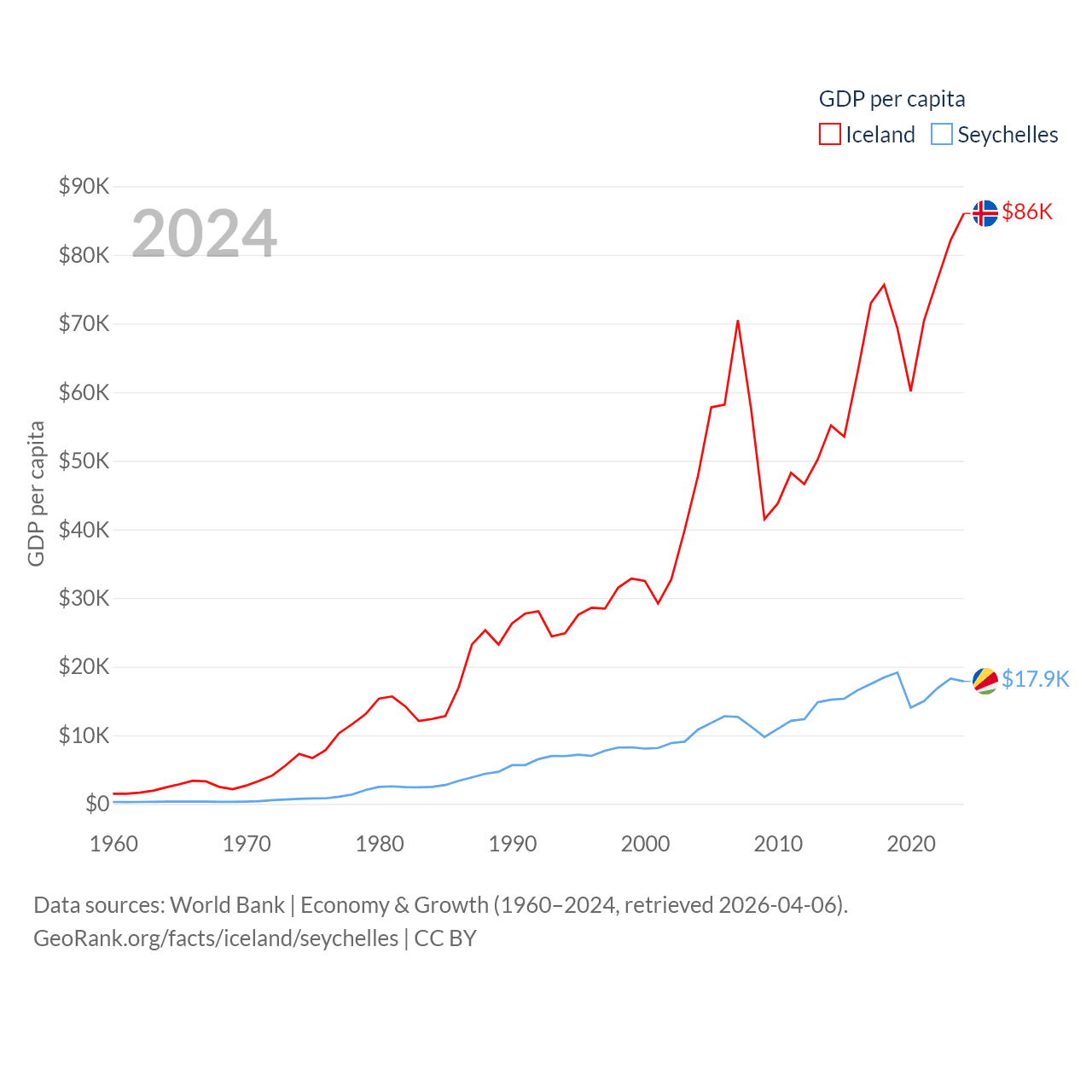 By GDP, Iceland ranks 108/197 ($33.3B) and The Seychelles ranks 178/197 ($2.17B). By GDP per capita, Iceland ranks 9/197 ($86,041), while The Seychelles ranks 63/197 ($17,859).