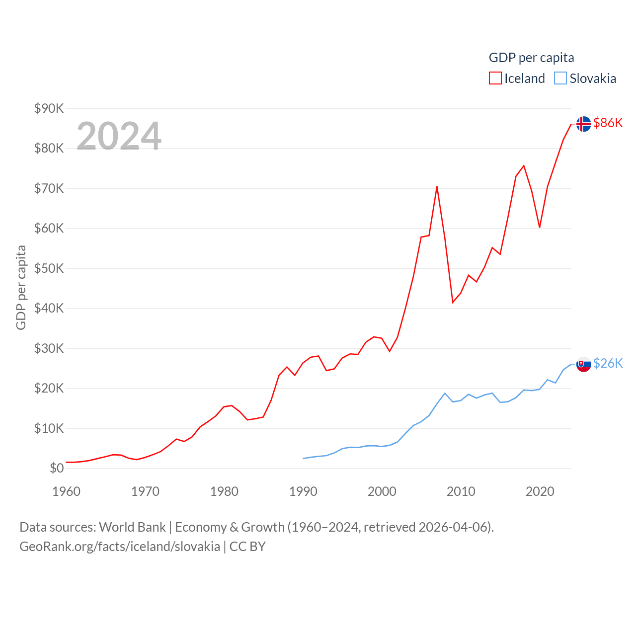 By GDP, Iceland ranks 108/197 ($33.3B) and Slovakia ranks 61/197 ($141B). By GDP per capita, Iceland ranks 9/197 ($86,041), while Slovakia ranks 47/197 ($25,993).