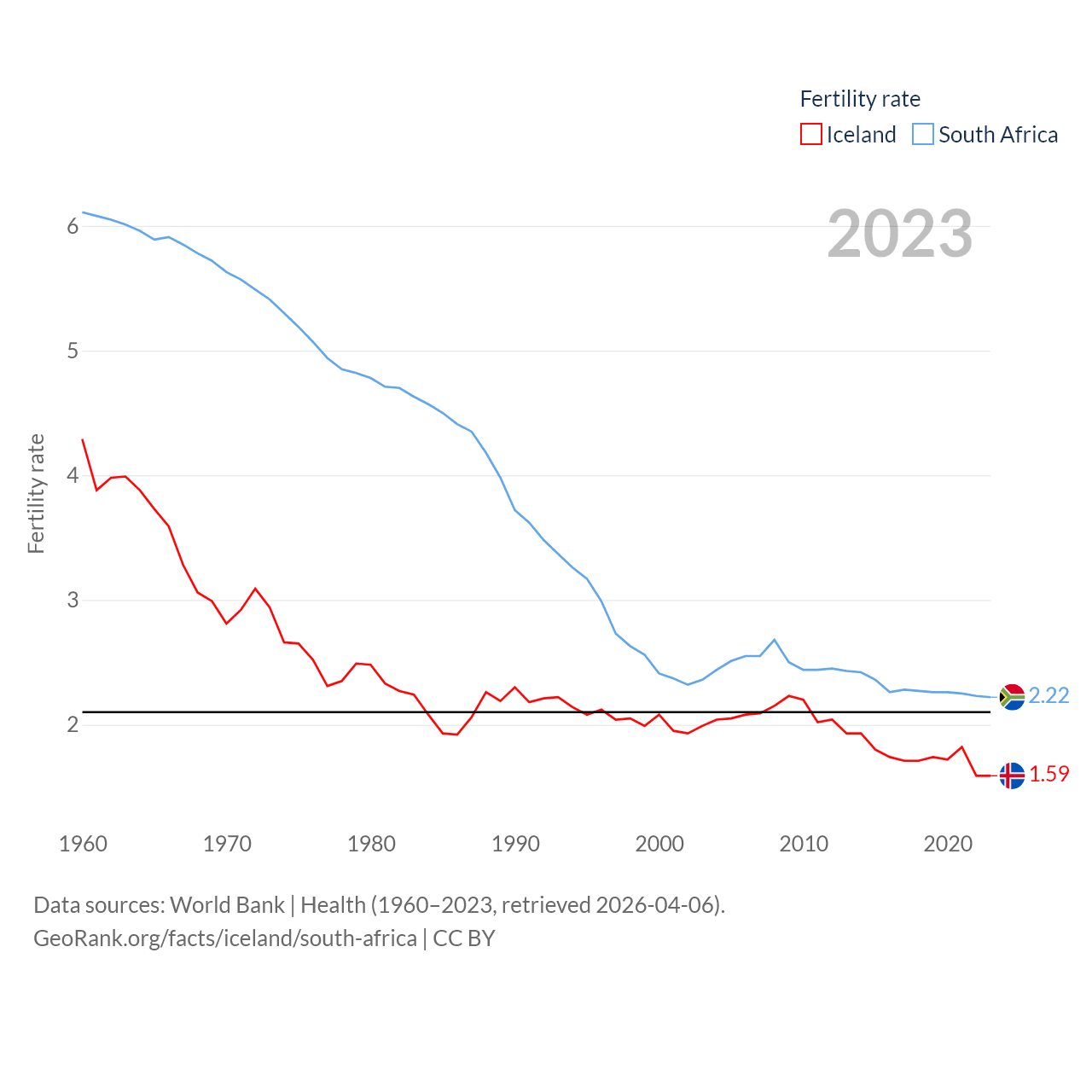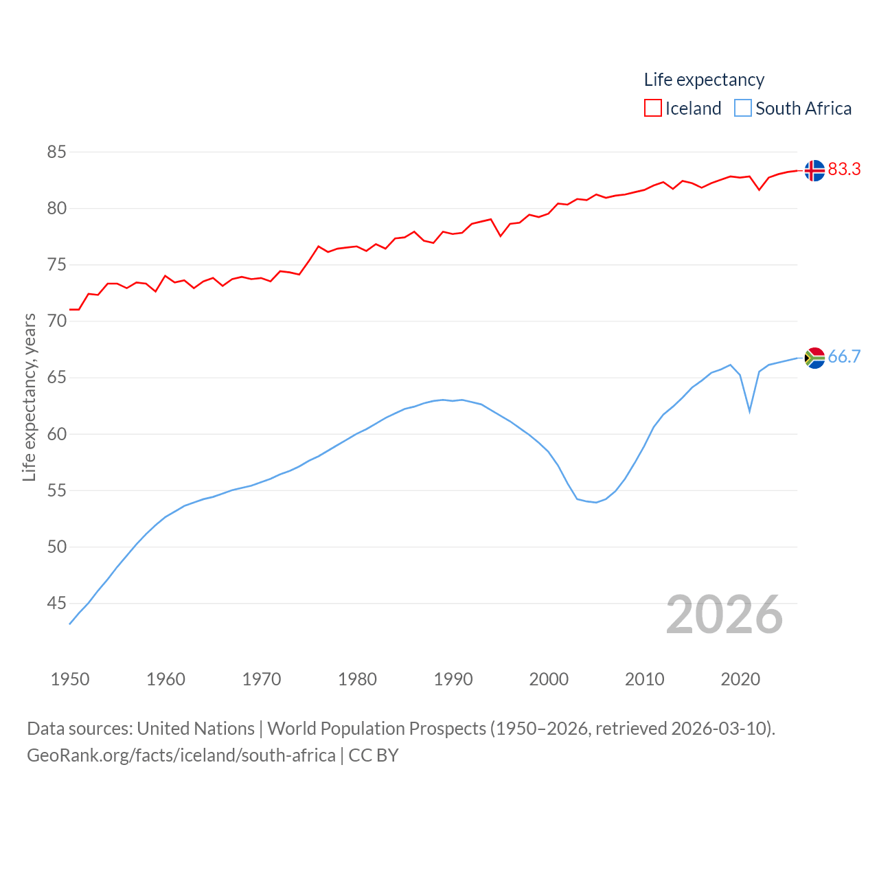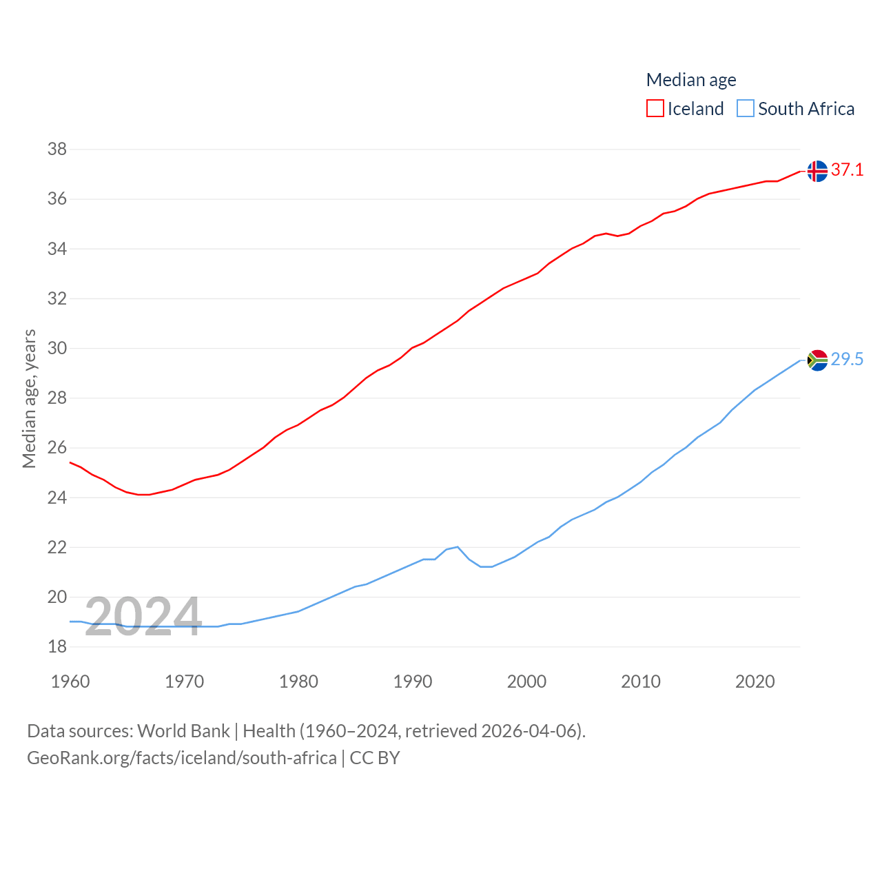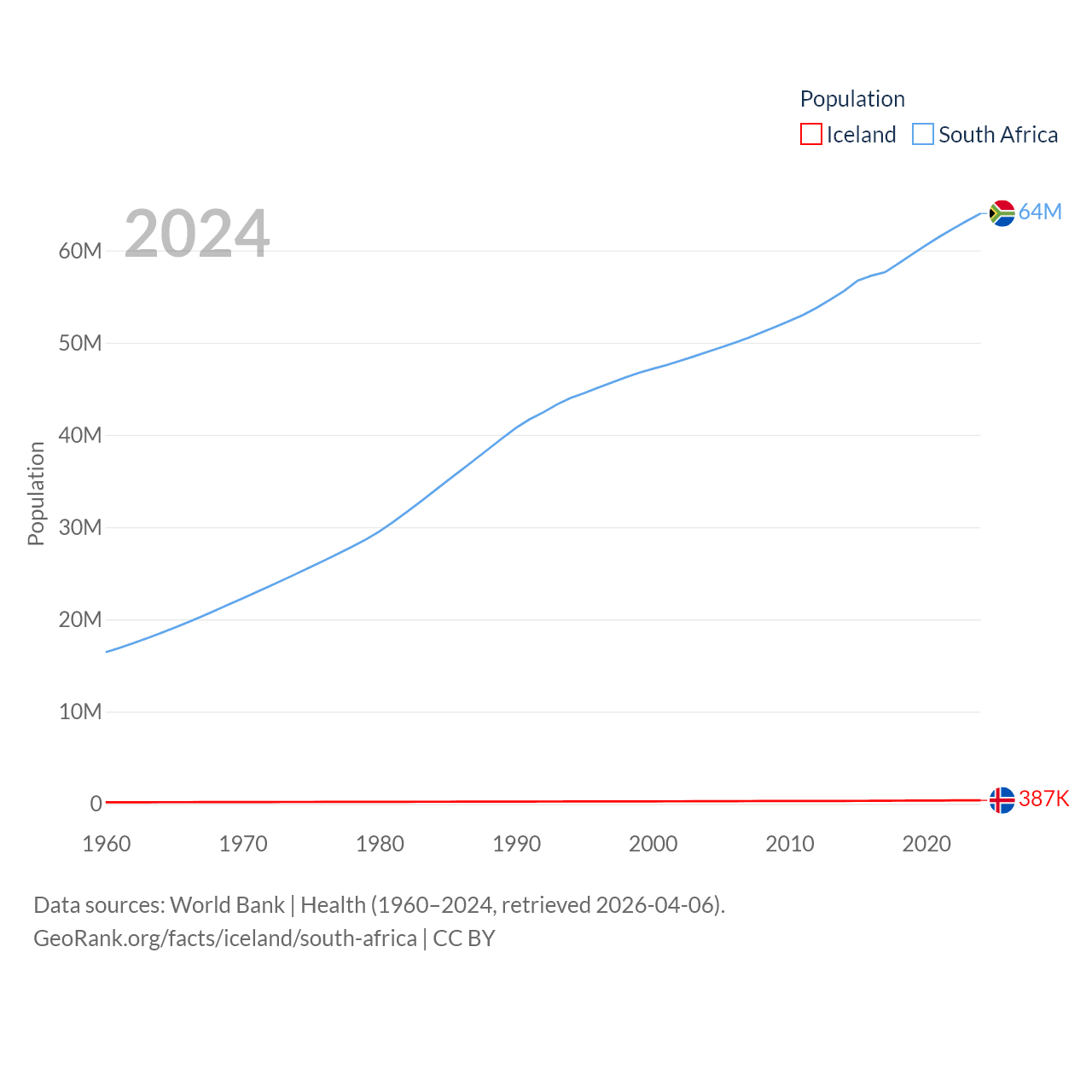 Iceland has a population of 387K (ranked 173/197), compared with 64M in South Africa (ranked 24/197). Iceland's land area is 38,931 sq mi versus 468,377 sq mi for South Africa (ranked 104th vs. 24th).
