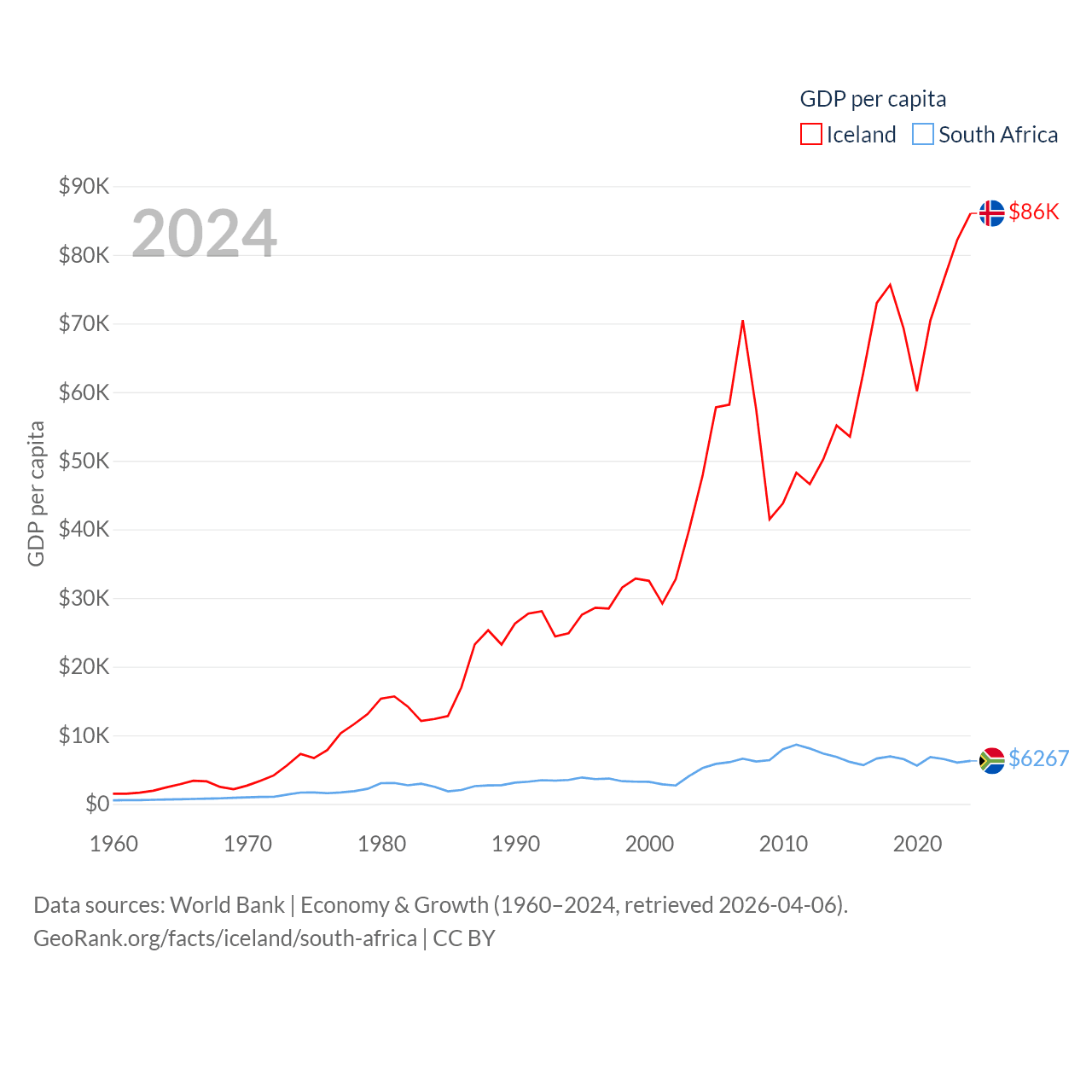 By GDP, Iceland ranks 108/197 ($33.3B) and South Africa ranks 40/197 ($401B). By GDP per capita, Iceland ranks 9/197 ($86,041), while South Africa ranks 111/197 ($6,267).