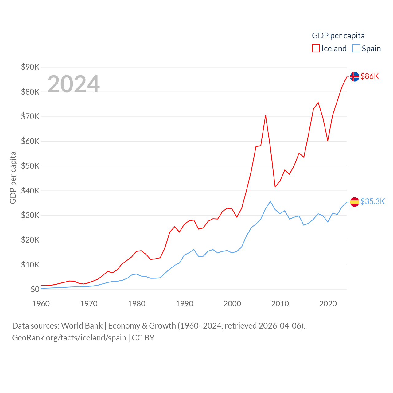 By GDP, Iceland ranks 108/197 ($33.3B) and Spain ranks 15/197 ($1.73T). By GDP per capita, Iceland ranks 9/197 ($86,041), while Spain ranks 32/197 ($35,327).