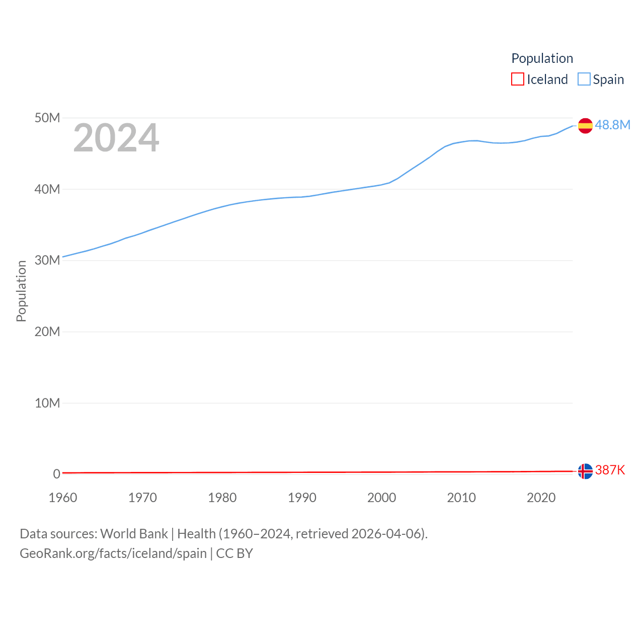 Iceland has a population of 387K (ranked 173/197), compared with 48.8M in Spain (ranked 32/197). Iceland's land area is 38,931 sq mi versus 192,934 sq mi for Spain (ranked 104th vs. 51st).