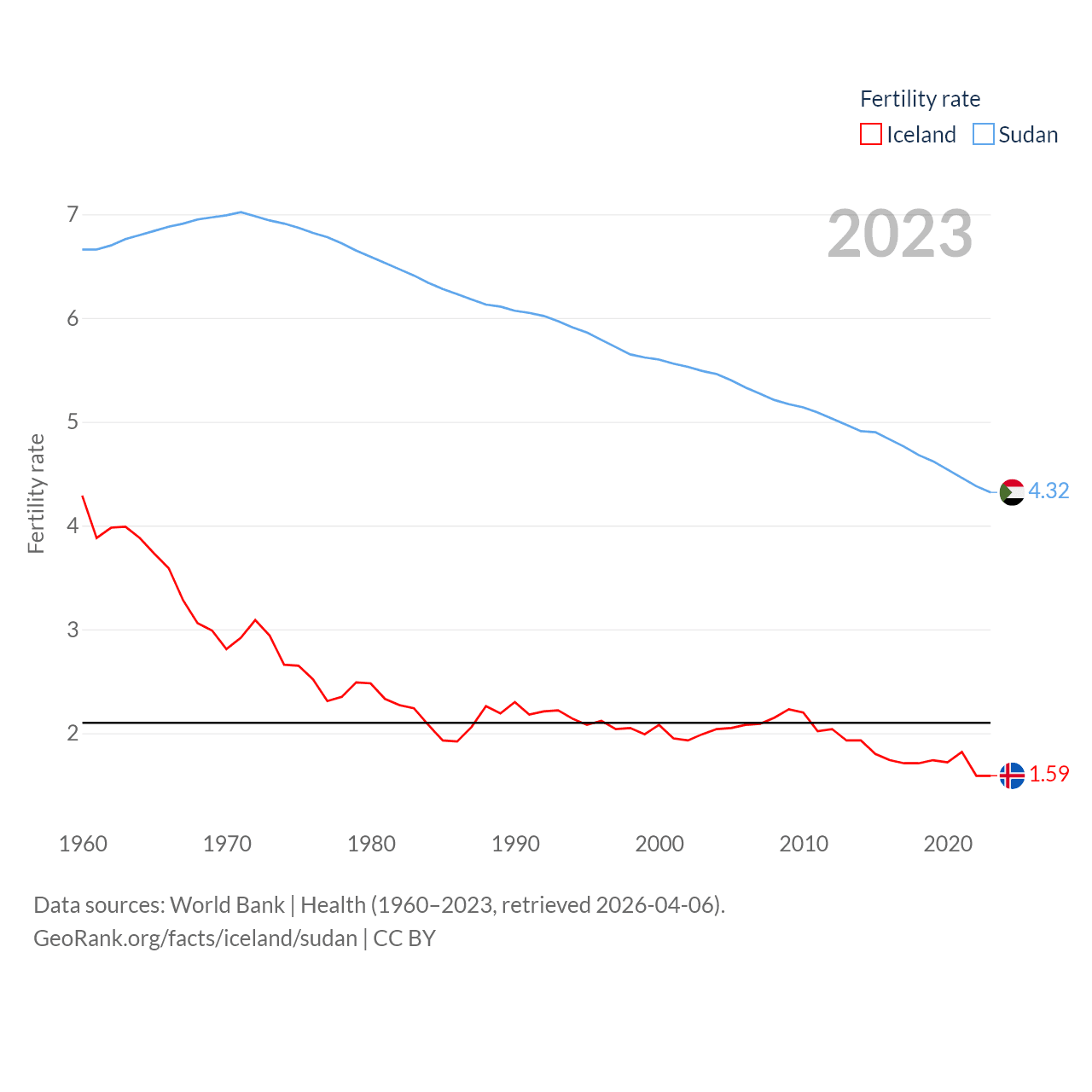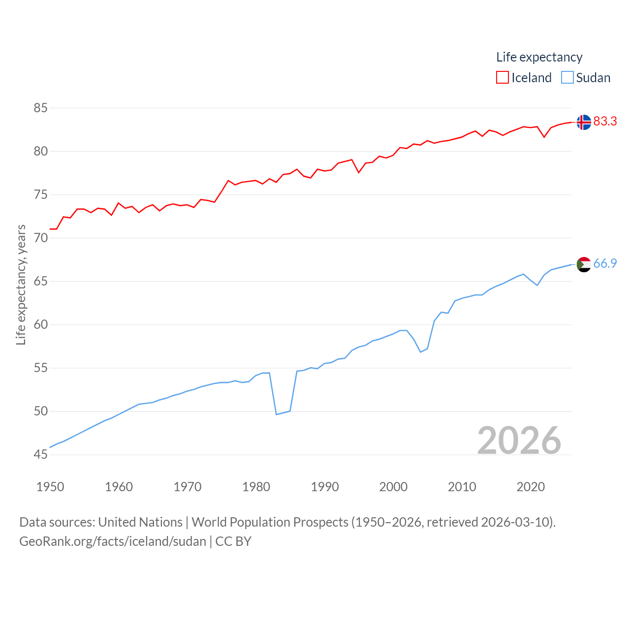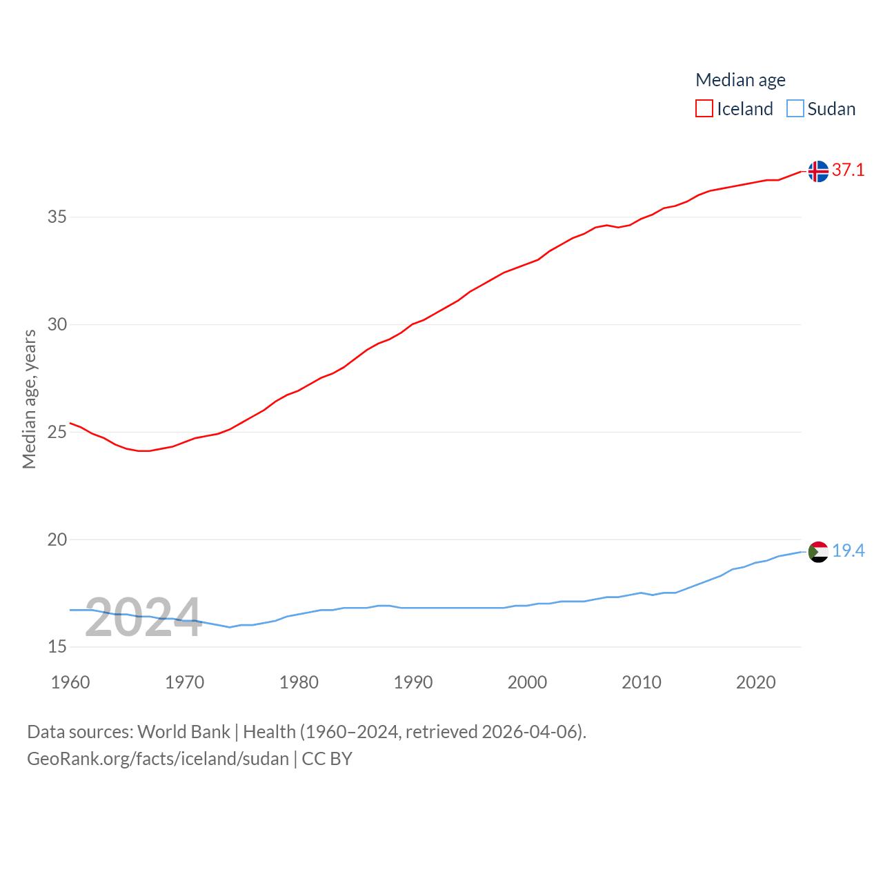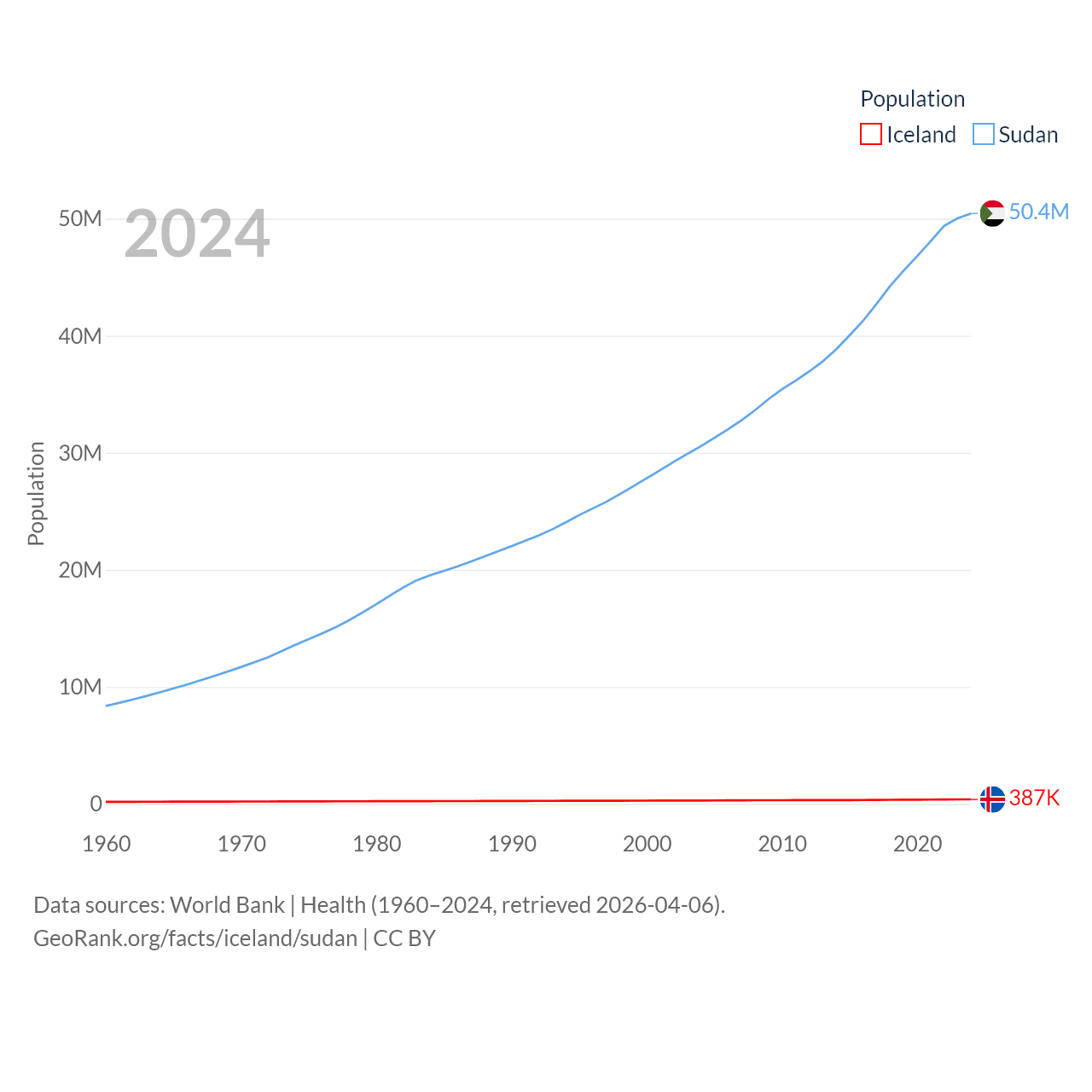 Iceland has a population of 387K (ranked 173/197), compared with 50.4M in Sudan (ranked 30/197). Iceland's land area is 38,931 sq mi versus 721,239 sq mi for Sudan (ranked 104th vs. 15th).